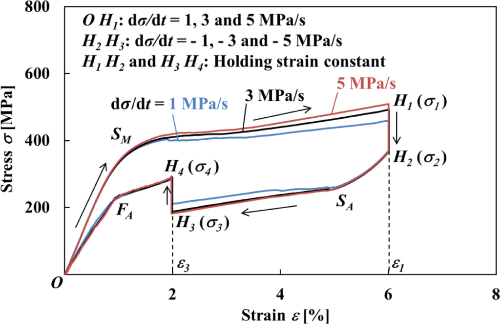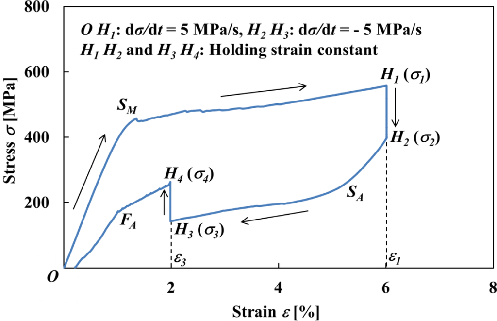 As can be seen in Figure 3, in the strain holding process at ε1 = 6% following loading till the strain ε1 under the stress rate dσ/dt = 5 MPa/s, stress decreases from σ1 to σ2, resulting in stress relaxation ∆σ = σ2 − σ1. In the strain holding process at ε3 = 2% following unloading till the strain ε3 under the stress rate dσ/dt = −5 MPa/s, stress increases from σ3 to σ4, resulting in stress recovery ∆σ = σ4 − σ3.