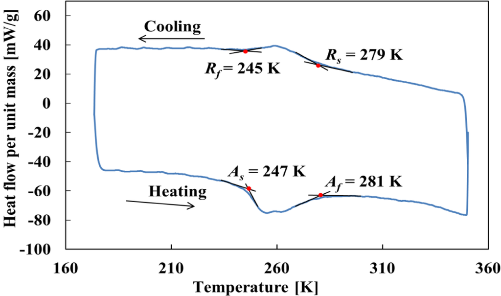 The material was a Ti-50.95at%Ni SMA tape to show SE at room temperature, produced by Furukawa Techno Material, Co., Ltd. (Hiratsuka, Japan). Thickness of the material was 0.37 mm, width 9.95 mm and length 170 mm. The material was held at 803 K for 1 min in the shape-memory heat treatment process. The differential scanning calorimetry (DSC) (Shimadzu, Co., Kyoto, Japan) thermogram of the material is shown in Figure 2. The R-phase transformation start and finish temperatures Rs and Rf, and the reverse transformation start and finish temperatures As and Af obtained by the DSC were 279 K, 245 K, 247 K and 281 K, respectively. The specimen was the tape with uniform shape. The gauge length was the distance of 100 mm between grippers. The specimen surface to observe the transformation band was mirror-finished with emery paper No. 2000. The specimen surface to observe the temperature distribution by thermography was covered with a uniform thin soot layer from a candle. In the process of covering the specimen surface with the soot, a small plate was used for the soot formation between the specimen and a candle. With this procedure, the specimen was kept away from the candle flame, and the influence of heat while covering the specimen surface with the soot was therefore slight.