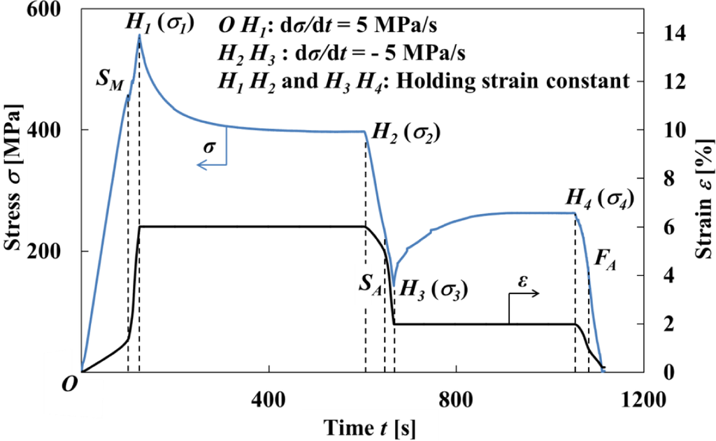 The stress-strain curve and variations in stress σ and strain ε with time t obtained by the test under a stress rate dσ/dt = 5 MPa/s until a point H1 at a strain ε1 = 6% followed by holding the strain ε1 constant and thereafter unloading under a stress rate dσ/dt = −5 MPa/s until a point H3 at a strain ε3 = 2% followed by holding the strain ε3 constant, are shown in Figures 3 and 4, respectively.