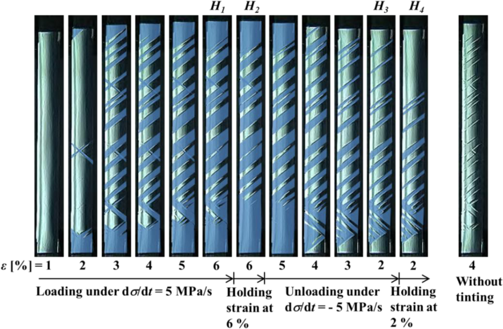 Figure 5 shows the photographs of the specimen surface at various strains taken by a microscope during the test which correspond to the stress-strain curve shown in Figure 3. The photograph on the right hand side shows the surface without tinting at a strain of 4% in the loading process. As can be seen from this photograph, although the interface of the transformation band can be observed, the region of the austenite phase (A-phase) and that of the martensitic phase (M-phase) are not clearly recognized at a glance. In order to show the region of the M-phase clearly, the M-phase is tinted by deep blue in Figure 5. In the loading process under a constant stress rate of 5 MPa/s, strain rate dε/dt increases from a strain of 2% to 3%, and the transformation bands appear on the whole specimen surface. After a strain of 3%, the interfaces of the appeared transformation bands propagate and strain increases. In the strain holding stage from the point H1 at a strain of 6% to the point H2, the MT progresses and the region of the M-phase expands a little. In the unloading process after stress relaxation (point H2), the reverse transformation progresses from the initiation location at the interfaces of the transformation bands and strain decreases. In the strain holding stage from the point H3 at a strain of 2% to the point H4, the reverse transformation progresses and the region of the A-phase expands a little.