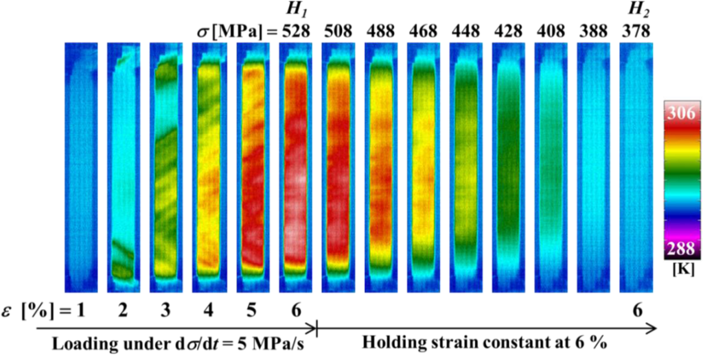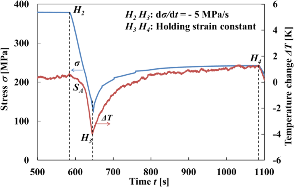 In the strain holding process, the average temperature on the specimen surface varies markedly in the early stage and thereafter gradually recovers the original temperature. Corresponding to this temperature change, stress relaxation and stress recovery appear markedly in the early stage while holding the strain constant and thereafter stress saturates gradually to a certain value;