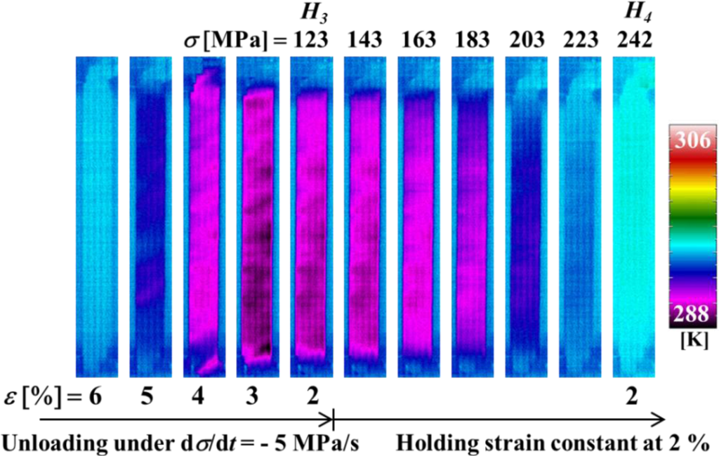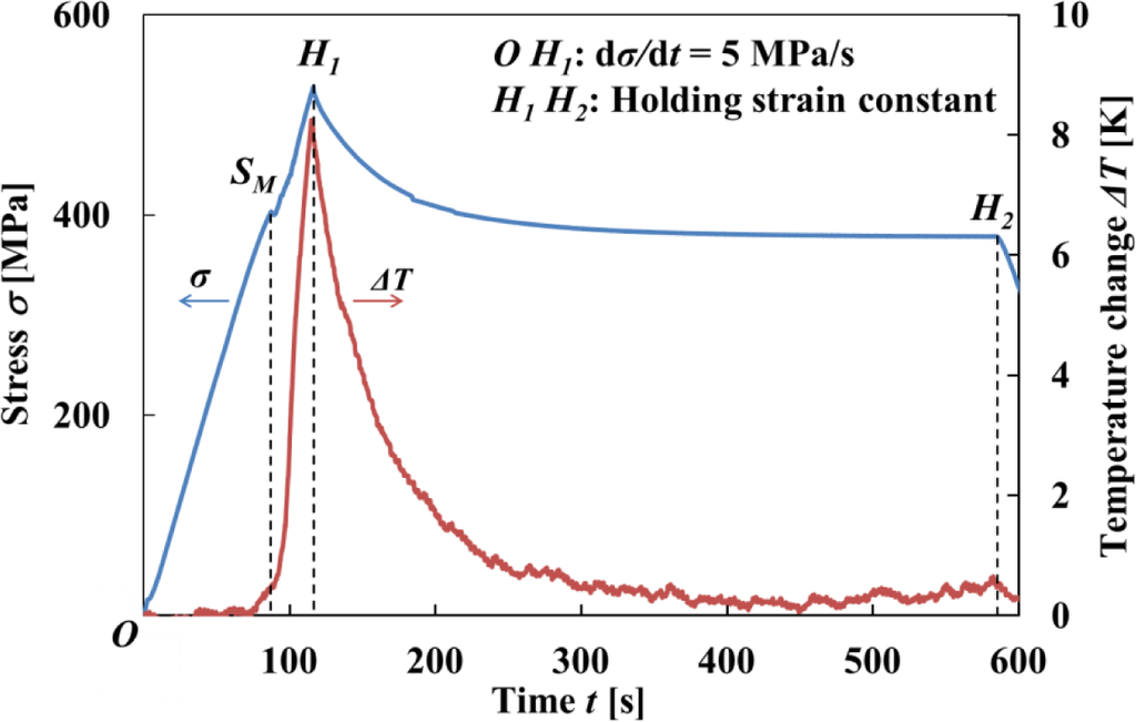As can be seen in Figures 6 and 7, in the loading process from the MT start point SM to the point H1 (ε1 = 6%) under a constant stress rate dσ/dt = 5 MPa/s, strain rate becomes high as shown in Figure 4 and there exists less time for the heat generated due to the exothermic MT to transfer to the atmospheric air, resulting in an increase in temperature of the specimen. In the strain holding stage from point H1 to point H2, the temperature decreases due to the air and the condition for the transformation to progress is satisfied, resulting in progress of the MT. As a result, stress relaxation appears while holding the strain constant.
