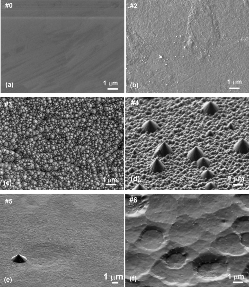 Evolution of surface morphology of plasma treated HOPG samples with treatment time as determined by SEM is shown in Figure 1. No effect on the surface morphology was observed in the first ten seconds of treatment (samples #0–#2). However, interesting morphological changes were observed after 15 s of treatment as the surface was fully covered with small nanocones, as seen in Figure 1c (sample #3 from Table 1). The height and width of the nanocones measured on the surface of this sample with AFM was about 100 nm and 150 nm, respectively (Figure 2). Longer treatment times ~20 s (sample #4) resulted in appearance of individual large cones with the size of about one micron (Figure 1d). Between these large cones we can still observe surface densely covered with small nanocones. This was no longer the case after 30 s of treatment (sample #5), where only some large cones remained, while small nanocones between them have disappeared (Figure 1e). The surface between large cones is now quite smooth and similar to the untreated sample. At very long treatment times (more than 40 s, sample #6) also large cones disappeared and shallow pits are observed (Figure 1f). From Figure 1 we can thus conclude that nanostructures on the surface as shown in Figure 1c,d are observed only for a limited range of plasma parameters.