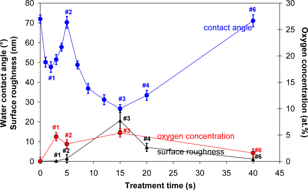 The surface wettability was measured immediately after plasma treatment by determination of the contact angle of a demineralized water drop in a static mode. A volume of a water droplet was 3 μL. A home-made apparatus equipped with a CCD camera and a PC computer was used for taking high resolution pictures of a water drop on the sample surface. Three samples were prepared for each treatment condition and for each sample five measurements were perform in order to minimize the statistical error. The contact angles were determined by software See System (Advex Instruments, Brno, Czech Republic) which enables fitting of the shape of a water drop and drawing the tangent to the water drop surface. The estimated error in contact angle determination was ±3°.