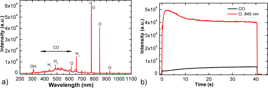 XPS results also indicate that oxygen radicals from plasma attack carbon atoms at surface via C–O bond formation and C–C bond breakage and leading to release of CO or CO2 molecules [46,47]. Oxidation of carbon probably takes place at the crystallographic borders which are weak points at HOPG surface. Formation of CO molecules was observed in OES spectra shown in Figure 5. The optical spectra revealed strong atomic oxygen lines (at 777 and 844 nm) and CO bands from 3rd positive as well as Angstrom transitions [48]. Furthermore, a broad continuum between 400 and 700 nm is observed, which was explained by partial overlapping of radiative transitions within CO molecule [48]. The results showed continuous decrease of oxygen lines and simultaneous increase of a CO line due to intensive oxidation of the graphite sample (Figure 5b). OH band and hydrogen atomic lines which are also observed in Figure 5a are due to desorption of water molecules from the surface of plasma reactor.