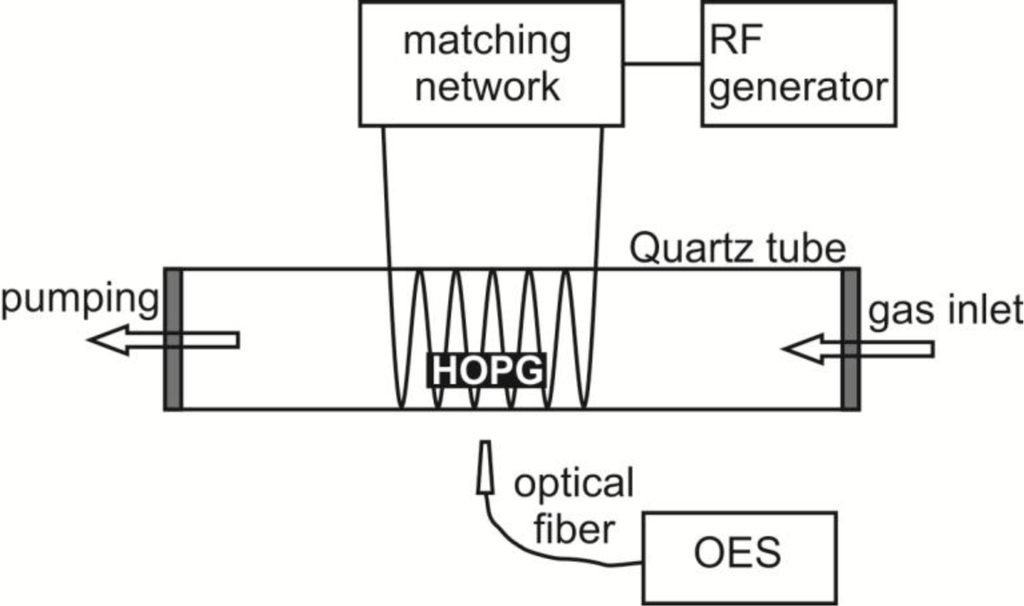 Samples of HOPG (ZYH type from NT-MDT) were exposed to oxygen plasma created by inductively coupled electrodeless radio-frequency discharge in pure H-mode [49]. A scheme of such plasma reactor is presented in Figure 8. Plasma reactor was composed of a discharge tube made from Quartz glass. A length of the tube was 80 cm and a diameter was 4 cm. A coil of 6 wounds was mounted in the center of the tube. Rather large distance between the coil and the grounded flanges was applied in order to minimize the capacity coupling. Plasma was created by an RF generator coupled to the coil via a matching network. The generator operated at the standard frequency of 13.56 MHz. The nominal power was set to 700 W. The discharge chamber was pumped with a Roots pump with a nominal pumping speed of 400 m3 h−1 backed by a two-stage oil rotary pump with a pumping speed of 80 m3 h−1. Commercially available oxygen was added into the discharge chamber through a flow controller. The pressure was measured by an absolute vacuum gauge. The pressure was fixed to 30 Pa and the flow rate was 22 L/s. Such experimental conditions allowed for practically 100% dissociation of oxygen molecules in H-mode and substantial concentration of atoms and metastable excited states [49]. The HOPG samples were exposed to such extremely non-equilibrium oxygen plasma for different periods. During HOPG treatment optical emission spectra (OES) were recorded to follow plasma-surface interactions. OES spectra were recorded by using spectrometer AVASPEC 3648 (Avantes Ltd, Leatherhead-Surrey, UK) with the spectra resolution of 0.5 nm in the spectral range from 180 to 1100 nm. The integration time was set to 50 ms.