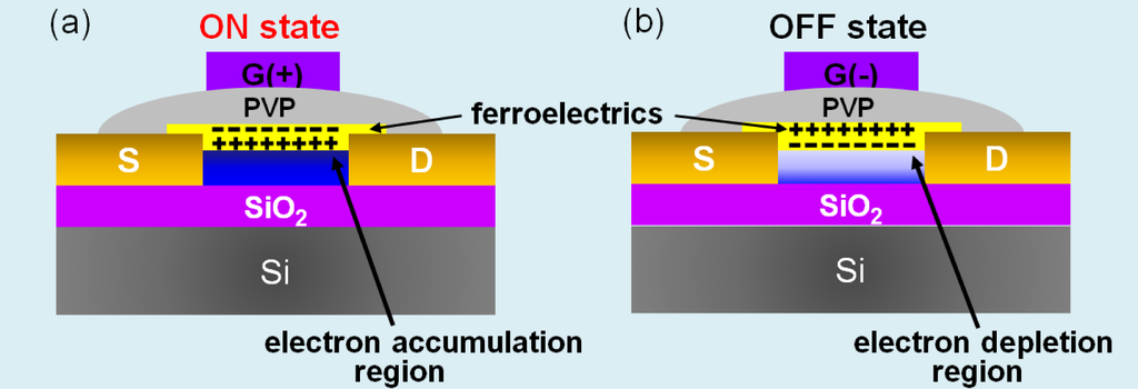 The intrinsic memory functionality of ferroelectric FETs based on a semiconducting channel and ferroelectric materials arises from the modulation of the charge carrier concentration in the channel, which defines two different conductance states, by switching the polarization of the ferroelectrics electrically, as shown in Figure 1. When a positive gate pulse is applied, the polarization of ferroelectrics is rearranged in the direction of the ferroelectric-semiconductor interface, resulting in the build-up of positive charges on the semiconducting surface. Subsequently, this leads to the accumulation of electrons and, thus, a high conductance state, corresponding to the ON state (Figure 1a) [7,12]. Conversely, when a negative gate pulse is applied, the negative polarization leads to the depletion of electrons and results in a low conductance state, that is, the OFF state (Figure 1b). Accordingly, to create novel functionality in FETs using ferroelectric materials as a new approach for the fabrication of programmable ferroelectric transistors, serving as a hybrid cell for memory, switch and display applications [34–37], we must first demonstrate ferroelectric LC-induced conductance modulation and hysteresis behaviour in a FET.