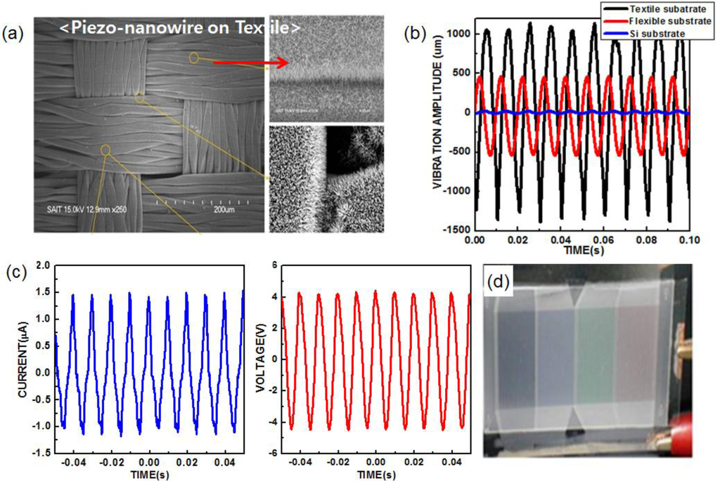 Furthermore, in order to address the issues related to the mechanical impedance of the substrate, we investigated various substrates toward an optimized harvesting system, as external mechanical energy sources are generally transferred into piezo-structures through the substrate. In this regards, textile with favourable form factors is one of the promising substrates for an effective harvester, due to its wide degree of freedom in shapes with flexible and stretchable characteristics, as well as higher efficiency in coupling external sonic waves into its own vibrational motion (Figure 10). Figure 10a shows the vibrational amplitudes of three different substrates, Si, flexible polyethersulfone (PES), and textile measured under the same input sonic power of 100 dB at 100 Hz using a laser optical vibrometer. The vibrational amplitudes were 30, 960 and 2250 μm for Si, flexible PES and textile substrates, respectively. With the optimized structures based on a textile substrate, the high output voltage and current of the harvester (8 V and 2.5 μA from 10 cm2) were generated as shown in Figure 10c. In addition, to demonstrate the capability of directly driving a practical display device, reflective mode display (PDLC display) panels (9 cm × 3 cm) were driven by the textile nanogenerator (Figure 10d) [46].