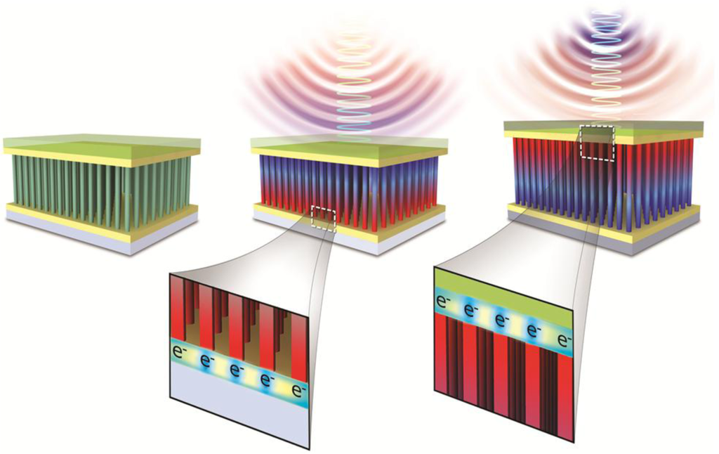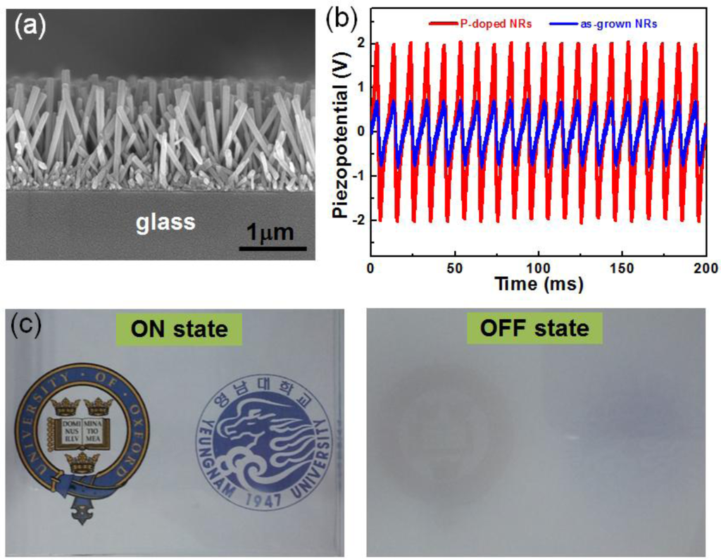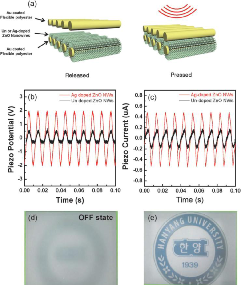 Recently, we successfully demonstrated operating PDLC light shutters using sonic-driven piezoelectric energy generators, as shown in Figure 9 [27]. It has been well known that the free electrons in an as-grown ZnO nanowire significantly screen piezoelectrically generated charges, resulting in decreasing the output piezopotential [26]. Therefore, to enhance the output characteristics, we introduced p-type counter dopants, such as P and Ag, to eliminate the free carrier screening effect by decreasing free electrons in the ZnO nanowire, because as-grown ZnO nanowires are naturally n-type semiconducting with superior conductivity due to oxygen deficiencies [26]. The doping process was carried out at low temperature compatible with glass substrate-based processes by using all solution processes based on a spin-on-dopant method [27]. Here, it is important to note that the low temperature process is crucial for the hybrid system to integrate energy harvesters into displays, because most of all the display components are fabricated based on glass or plastic substrates.