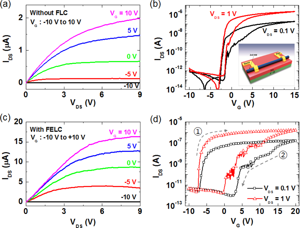 In order to address whether the ferroelectric polarization of LCs can affect the electrical transport in FETs, we performed output (source-drain current versus voltage, IDS-VDS) and transfer (source-drain current versus gate voltage, IDS-VG) measurements with a conventional back-gate FET device structure (the inset of Figure 2b) [7]. Figure 2a,b shows the representative data of the output characteristics and transfer characteristics of a back-gate ZnO nanowire FET without a ferroelectric LC layer, respectively. The output curves exhibit well-defined linear regimes at low biases and saturation regimes at high biases, showing the typical pinch-off characteristics of n-type semiconductor FETs [7,11,12,38]. It was observed that the back-gate nanowire FET exhibited negligible hysteresis, being caused by uncontrolled chemical species adsorbed on the ZnO nanowire when exposed to ambient air [7,12], before coating ferroelectric LCs, as shown in Figure 2b. Figure 2c,d shows the electrical properties of the ferroelectric LC-coated nanowire FET with a back-gate structure. Noticeably, we observed that the electrical performance of ZnO nanowire FETs is significantly improved after coating a ferroelectric layer. Here, note that we performed electrical measurements with the same device before and after the coating of ferroelectric LCs in order to circumvent size and morphology effects, such as the channel length and nanowire diameter. Thus, the main reasons causing the conductance enhancement of the nanowire FET with a ferroelectric LC layer can be due to the polarization effect, as well as the suppression of chemisorption effects of oxygen and/or water molecules at the ZnO surface [7,39]. It was also observed that the FET (Figure 2d) exhibits a clockwise hysteresis behaviour obtained with a double sweep of the gate voltage from −10 to 20 V at variable drain voltages (VDS = 0.1 and 1 V). Here, an interesting finding is that the hysteresis width of the nanowire FET considerably increases after coating a ferroelectric LC layer compared with that of the conventional nanowire FETs without a ferroelectric LC layer (Figure 2b). These results indicate that the channel conductance and threshold voltages of ZnO nanowire FETs are strongly dependent on the channel charge density of the ZnO nanowires, which can be effectively modulated by the polarization of ferroelectric LCs.