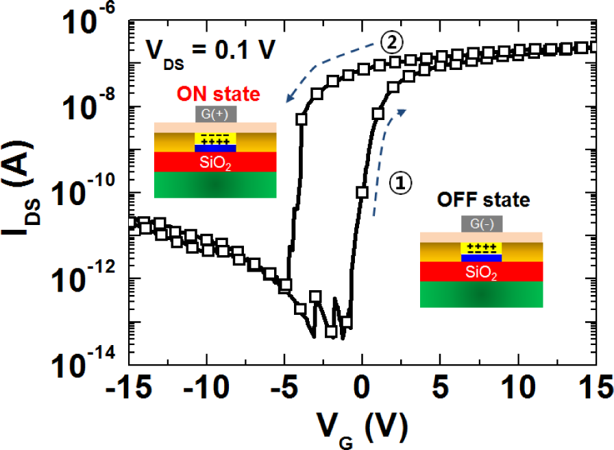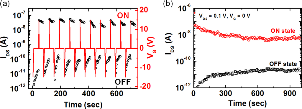 To demonstrate the practical memory properties of ferroelectric LC-coated nanowire FETs, we investigated the switchability and retention time of a device with a top-gate structure [7]. Figure 4a shows the reversible, reproducible ON and OFF switching characteristics of a memory device. Two different conductance states, defined as the ON (high conductance) and the OFF (low conductance) states of a memory, were measured at the read gate voltage (VG = 0 V) after the application of a writing and an erasing gate voltage pulse of 15 and −15 V, respectively.