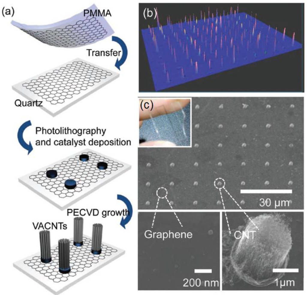 Graphene was synthesized on a Cu foil (75 μm) using a thermal chemical vapour deposition (CVD) method and transferred onto the quartz substrate. The reaction chamber was heated to 1000 °C and then CH4 (5 sccm), Ar (1000 sccm) and H2 (200 sccm) gases were introduced into the reaction chamber for 2 min. After coating PMMA film on a graphene/Cu substrate, the Cu film was removed by submerging the film into Cu etchant (CE-100, TRANSENE Company, Danvers, MA, USA). The graphene/PMMA film was then transferred onto a quartz substrate. This process was repeated to obtain several layers of graphene. Conventional photolithography was used to make dot arrays with a ~1 μm dot size and ~15 μm spacing between dots. 10 nm Al and 1 nm Fe layers were deposited as catalysts for CNT growth. Vertically aligned CNTs were synthesized by remote plasma-enhanced CVD with Ar (200 sccm), H2 (200 sccm) and C2H4 (75 sccm) gases at 750 °C for 5 min.