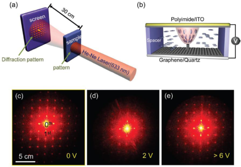 Figure 6 shows the diffraction pattern through the graphene/vertically aligned CNTs (VACNTs) hybrid structure as a function of the applied voltage from zero to 6 V [16]. We used a He-Ne Laser with a 633 nm wavelength to generate diffraction patterns from the graphene/VACNT hybrid structure on a quartz substrate, as shown in Figure 6a.