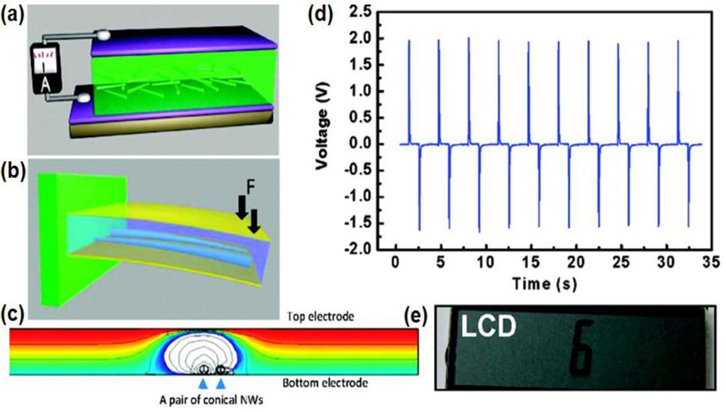 LCs, basically, are operated by voltages, which are favourable power consumption characteristics to the piezoelectric energy harvester without the need for a high current supply. In this regard, Wang’s group at the Georgia Institute of Technology reported that a piezoelectric nano-generator can generate enough energy to drive a small LC display (Figure 8) [45]. They demonstrated that the harvesting performance is enhanced by using conical ZnO nanowires. Due to the geometrical shape, the nanowires are assembled with a unipolar feature, which is probably the key for producing a macroscopic piezoelectric potential in the direction normal to the substrate. This harvester produced output voltage up to 2 V (an equivalent open circuit voltage of 3.3 V) with a few hundreds of nano amperes of output current, which can drive a small LCD panel.