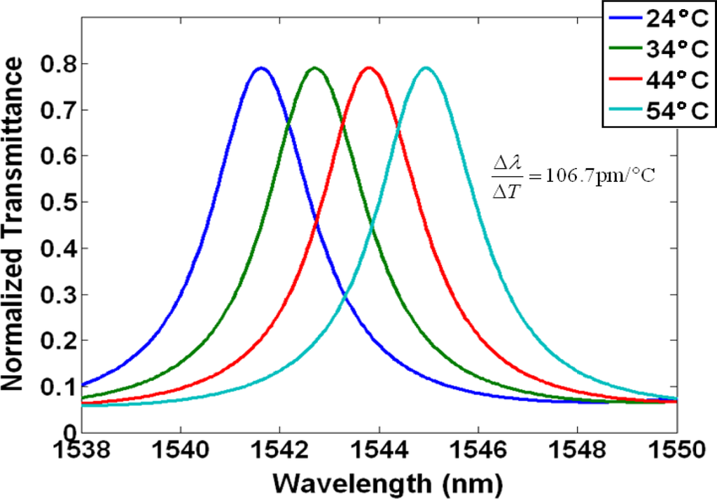 In modern dense wavelength division multiplexing (DWDM) systems with channel spacing of <1 nm, a difference of Δλ/ΔT = 106.7 pm/°C will greatly influence channel location and crosstalk [].