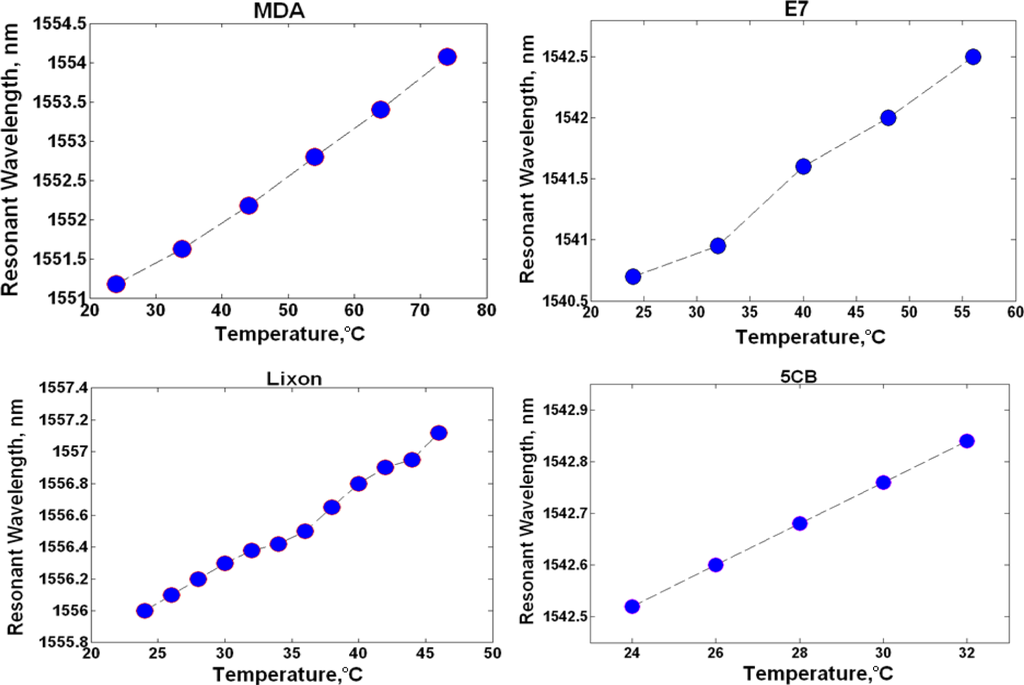 It can be seen in Figure 2 that the resonant wavelength shift of LC clad ring resonators is linear. This is to be expected, as the average LC index decreases linearly as temperature rises in both the anisotropic and isotropic phase [,].