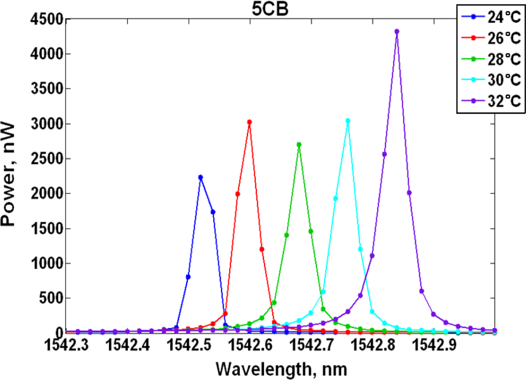 Ring resonator samples consisting of 9.9 μm radius, 500 nm width, 250 nm height, 100 nm gap between the ring and bus waveguide were characterized. A measurement was performed on a sample clad in air, which resulted in an 87.5 pm/°C resonance shift and it served as the baseline. Subsequent measurements were completed with liquid crystal claddings listed in Table 1. It should be noted that the samples did not rely on an alignment layer in order to achieve a specific liquid crystal orientation and the liquid crystals were assumed to be randomly oriented exhibiting an average refractive index <n>. The experimental results are shown in Table 2 and Figure 2, where Table 2 provides a summary of the observed resonance shift per degree Celsius, while Figure 2 tracks the resonant wavelength change as a function of increasing temperature. MDA-05-2968 LC produced a peak wavelength shift of 58 pm/°C, while the best response was attained with 5CB (40 pm/°C) and it is further detailed in Figure 3, where the measured resonance is shown at each temperature increment. Samples clad in E7 and Lixon presented a thermal drift of 56.3 pm/°C and 52.3 pm/°C, respectively.