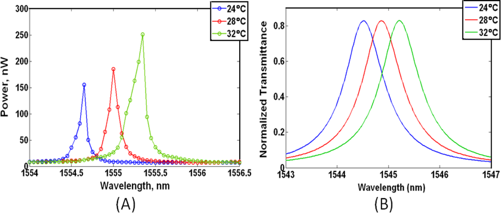 Figure 1 depicts a 2D finite-element simulation in COMSOL Multiphysics (Palo Alto, CA, USA) showing the projected fundamental TE like mode resonance shift due to rising temperature for a silicon ring clad in SiO2. Silicon photonic waveguides commonly consist of a silicon core and silica claddings, because the large refractive index contrast between the core and cladding allows for total internal reflection with a very large incident angle [–]. Typically, the TE like mode is more frequently used than the TM like mode due to its low bending loss, stronger confinement in the waveguide core, and minimal leakage into the silicon substrate beneath the buried oxide (BOX) layer. In this simulation, the ring was 500 nm wide, 250 nm tall, and with a perimeter of 62.2 μm. The effective index method was used in defining the effective mode indices and propagation constants of our ring resonator. The high TOC of silicon (ΔnSi/ΔT = 1.86 × 10−4/°C) together with the TOC of SiO2 (ΔnSiO2/ΔT = 1 × 10−5/°C) resulted in a 3.2 nm resonance shift for a 30 °C change in temperature, from 1541.7 nm to 1544.9 nm, which translates to Δλ/ΔT = 106.7 pm/°C.