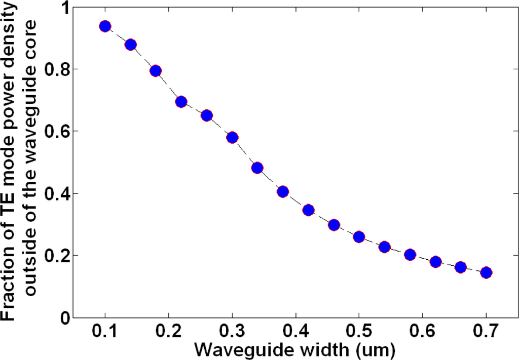 While liquid crystals aid in minimizing temperature associated effects, complete athermal response cannot be achieved without modifying the device geometry. The amount of thermal stabilization is directly related to the extent of the optical mode overlap with liquid crystals, or any other negative TOC material. For instance, the mode of narrower waveguides will sense more of the liquid crystal cladding due to a larger portion of it being present outside of the silicon core region. An example of this appears in Figure 5, which depicts the amount of TE like mode power density that extends outside of the waveguide core as a function of waveguide width. For a 500 nm wide, 250 nm tall silicon waveguide surrounded by n = 1.53 index cladding, a 26% mode overlap with the cladding region is achieved. A 300 nm wide waveguide will result in a 58% cladding overlap. It should be noted that, besides device geometry, the exact cladding material’s refractive index and surface roughness also come into play in mode confinement and propagation loss. Thus, while a narrower waveguide allows for increased interaction with the liquid crystal cladding, it also results in enhanced losses arising from a larger portion of the optical mode interacting with the sidewall surface roughness of the silicon core []. These interface imperfections originate during the fabrication process from line edge corrugations of the electron beam resist, pattern transfer, or from the etching process itself []. The roughness of core–cladding interfaces results in transmission loss that scales with the square of the roughness amplitude [], which is the main reason why we chose waveguides of 500 nm width for our experiment as compared to narrower ones.