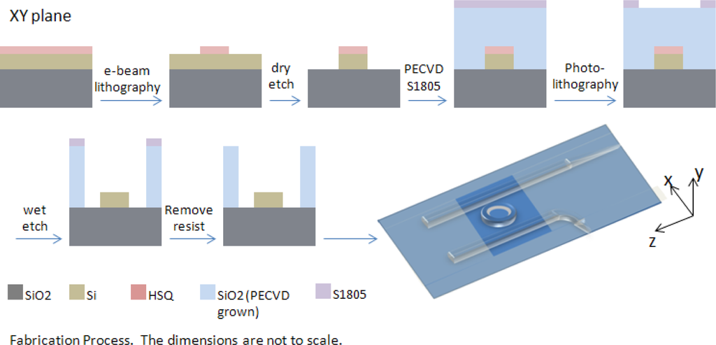 Samples were fabricated using a 680 μm thick silicon on insulator (SOI) wafer composed of a silicon handle, a 3 μm BOX layer and 250nm of silicon placed on top of the BOX. The 3 μm SiO2 layer aids in preventing the evanescent field of the optical mode from penetrating the silicon substrate below. Dow Corning (Midland, MI, USA) FOX-16 electron beam (e-beam) resist was diluted in Methyl isobutyl ketone (MIBK), one part FOX-16 to two parts MIBK (by weight), and spun at 4000 rpm resulting in a 180 nm thick coat []. The samples were patterned with a Vistec (Toronto, Canada) EBPG 5200 e-beam system using a dosage of 5120 μC/cm2 and developed in Tetramethylammonium hydroxide (TMAH) for 1 min. Dry etch of silicon was performed using Oxford Plasmalab 100 RIE/ICP (Oxford Instruments, Abingdon, Oxfordshire, UK) with a mixture of 25 sccm of SF6 and 50 sccm of C4F8 at a temperature of 15 °C, and with a reactive-ion etching (RIE) power of 30 W and inductively coupled plasma (ICP) power of 1200 W. The resulting silicon waveguides were covered by a 1800 nm layer of SiO2 cladding deposited via Oxford Plasmalab 80 Plus plasma-enhanced chemical vapor deposition (PECVD) at 350 °C using a mixture of 5% SiH4 and 95% N2 at 117 sccm with 710 sccm of N2O at a deposition rate of 72 nm/min. The PECVD chamber pressure was 1000 mT and the RF power was 20 W at 13.56 MHz. Window areas positioned over resonator rings were patterned with Shipley S1805 photoresist (Shipley Company, Marlborough, MA, USA), exposed in a Hybrid Technology Group (HTG) Mask Aligner and etched in a CMOS grade buffered oxide solution (BOE) consisting of 33.5% NH4, 7% HF, and 59.5% H2O, for a duration of 195 s. The remaining S1805 photoresist was removed with Shipley Microposit Remover 1165 (Shipley Company, Marlborough, MA, USA). The fabrication process is portrayed in Figure 6 and scanning electron microscope (SEM) images of the fabricated samples appear in Figure 7. Figure 7A depicts a silicon ring resonator of 9.9 μm radius and 500 nm width. Figure 7B shows the ring resonator sample clad in SiO2 and with a window etched over the ring to accommodate the LC cladding. Placement of the liquid crystal cladding was carried out in a clean room environment and preceded by a sample cleaning step using oxygen plasma. The oxygen plasma step aids in the removal of organic contaminants and it promotes adhesion and bonding to other surfaces.