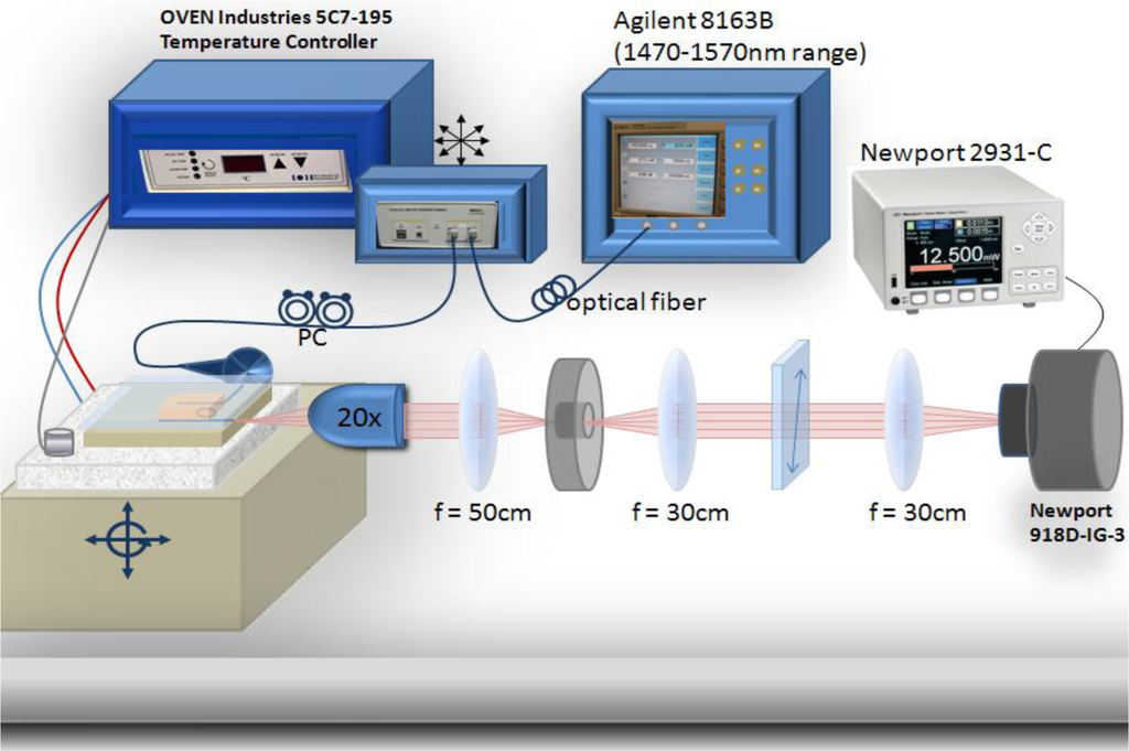 Our experimental setup consisted of an Agilent 8163B telecom-grade tunable laser (Santa Clara, CA, USA) (1470–1570 nm range) connected to a polarization scrambler and fiber coupled to the on-chip waveguide. An Oven Industries 5C7-195 Benchtop Temperature Controller (Mechanicsburg, PA, USA) linked to a thermo-electric module assisted in the heating and cooling of the LC mixture. The thermoelectric module was embedded inside of a sample mount and the sample mount was placed on a three axis mechanical stage allowing for precise alignment with the input beam and imaging optics. A thermocouple fastened to the sample stage monitored the temperature to within 0.1 °C precision. The transmission spectrum was imaged in free space onto a Newport 2931-C power meter (Newport Corporation, Irvine, CA, USA). Control of the telecom source and the power meter was automated. The optical setup is illustrated in Figure 8.