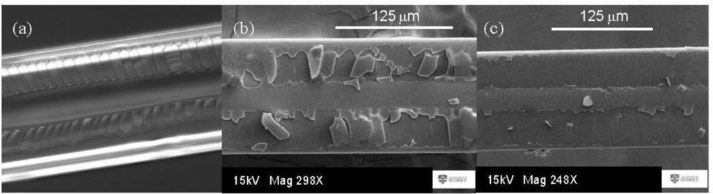 Beyond this, the film is observed under low-resolution scanning electron microscopy to be quite uniform over the core. This halting of crack propagation is indicative of significantly different surface interactions at the core and can, in part, be explained by the slight geometric protrusion of the inner cladding and core outwards from the D-flat, affecting convective flow and stress gradients beyond this point. It is an indication that controlled evaporation at slower rates may reduce or even avoid crack formation altogether outside the inner cladding, though difficult to implement. Some success in crack mitigation is obtained by adjusting conditions, although the coloration observed is a direct measure of film stresses, and the presence of variation indicates non-uniform thicknesses. Alternatively, the induced stresses are sufficiently uniform along the fibre, that the fracturing that takes place is periodic, and this could be of use in novel devices, since it is in these regions where post-doping with functional species will likely accumulate most. In the SEM images, it appears that the removal of the layers is occurring only in the outer cladding region, whereas the core region seems intact. This might suggest that surface attachment is stronger at the core and inner cladding regions (where surface defect sites, for example, are going to be in much higher concentrations and wetting properties will differ), or more likely, stresses and packing are higher on the latter planes and, therefore, fracturing far more likely. The high current and exposure time of the 15-kV electron beam may also be sufficient to induce these plates to lift off.
