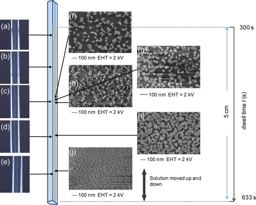 In contrast to the horizontal approach, vertical dip-and-withdraw at constant velocity leads to tapered layers, because the end of the fibre spends more time immersed than further along the fibre. This is illustrated in Figure 3. In these experiments, results were obtained for a stage velocity of 0.3 mm/s, resulting in total dwell times over a 5-cm length varying from t0 = 300 s to t = 633 s, more than double the rest dwell time, t0. The higher velocity was found to reduce crack generation in the vertical dip-and-withdraw method. In contrast to the previous results, optical images showed little strong film interference, indicating the layers, if present, are much thinner.