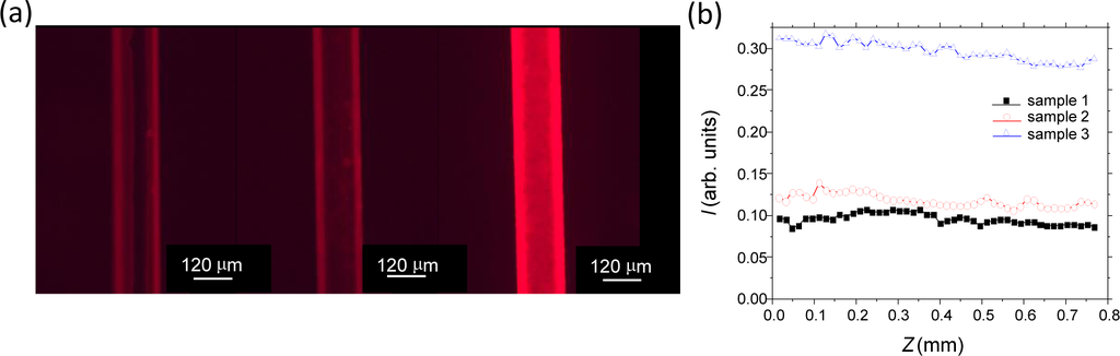 Images of the three scans are shown in Figure 9b. When present, the Rhodamine B is visible as a pink colouring. From this image, it can be seen that very little dye is visible in Sample 1, so simply coating the D-fibre shows very little attachment. By contrast, when silica nanoparticle coatings are present, the dye is clearly visible.