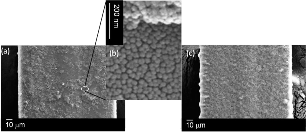 In order to better understand the origin of these differences and explore any surface topology, the films on Samples 2 and 3 were examined under SEM. Figure 5a–c shows the overall SEM images for both samples. Close examination reveals that there are three distinct regions visible for Sample 2: a uniform thin film layer with very little surface variation suggesting good film formation initially (close-up in Figure 5b), probably only a few layers thick at best (<100 nm), followed by a layer where there is less tidy, or random, packing, with particles appearing spread out over the first layer and, finally, the aggregating and clumping of particles with very high surface topology (Figure 5a). Thus we identify three types of deposition processes. The first appears to be uniform and, all over the fibre, flat; but, because they are on the nanoscale (<100 nm), they cannot be detected optically (no thin film interference). On the other hand, they give rise to the 20% or so increase in the fluorescence signal observed (where the data in Figure 4b was taken from the core region where the fluorescence was most uniform). The second regime, where additional particles appear intermittent and less regular on the surface, is not so uniform (Figure 5a). Then, there are significant clumps or aggregates of particles in no specific order, although closely packed within, and these are clearly much thicker: the amount of this material increases with the number of passes, suggesting that two or less passes are required to obtain a reasonably well-packed mono-layer or a few layers. In the fluorescent images, the regimes where surface topology varies give rise to the brighter fluorescence spots that appear.