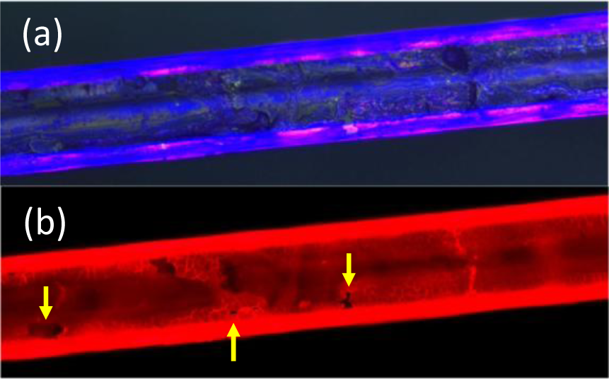 Overall, fluorescence from Rhodamine B added to the silica layers helps to improve an optical assessment of the layer formation. SEM analysis confirms the presence of nanoparticles everywhere. As suggested by the first optical images, in samples coated with silica dye, it can be added to highlight those areas that are indeed coated and those that are not. Fluorescence contrast between uncoated regions and coated regions is clear; an example where a coating is not uniform despite large colouring from thin film interference is shown in Figure 6. The Rhodamine B also highlights bend-induced cracking arising from the handling of the sample. Notably, it does not necessarily correlate with areas on the optical image that suggest a hole is present. Part of this added illumination stems from light trapped by thicker layers, as well as the optical fibre itself (which is why the edges are saturated).