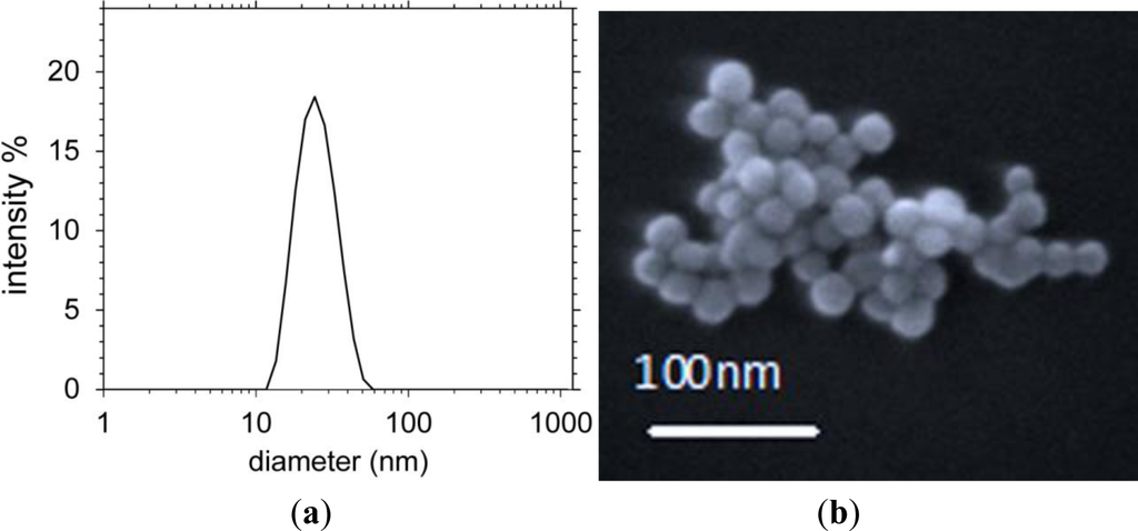 Commercially available colloidal silica nanoparticles in water (40% w/w, H2O, pH = 9) were diluted to 2.5 wt% for this work. The size distribution was determined using dynamic light scattering (DLS) and scanning electronic microscopy (SEM) to be within 20–30 nm in diameter (shown in Figure 7). The size of these particles is obviously much smaller than those required to self-assemble opal-like crystals with fcc packing for near-infrared and visible applications.