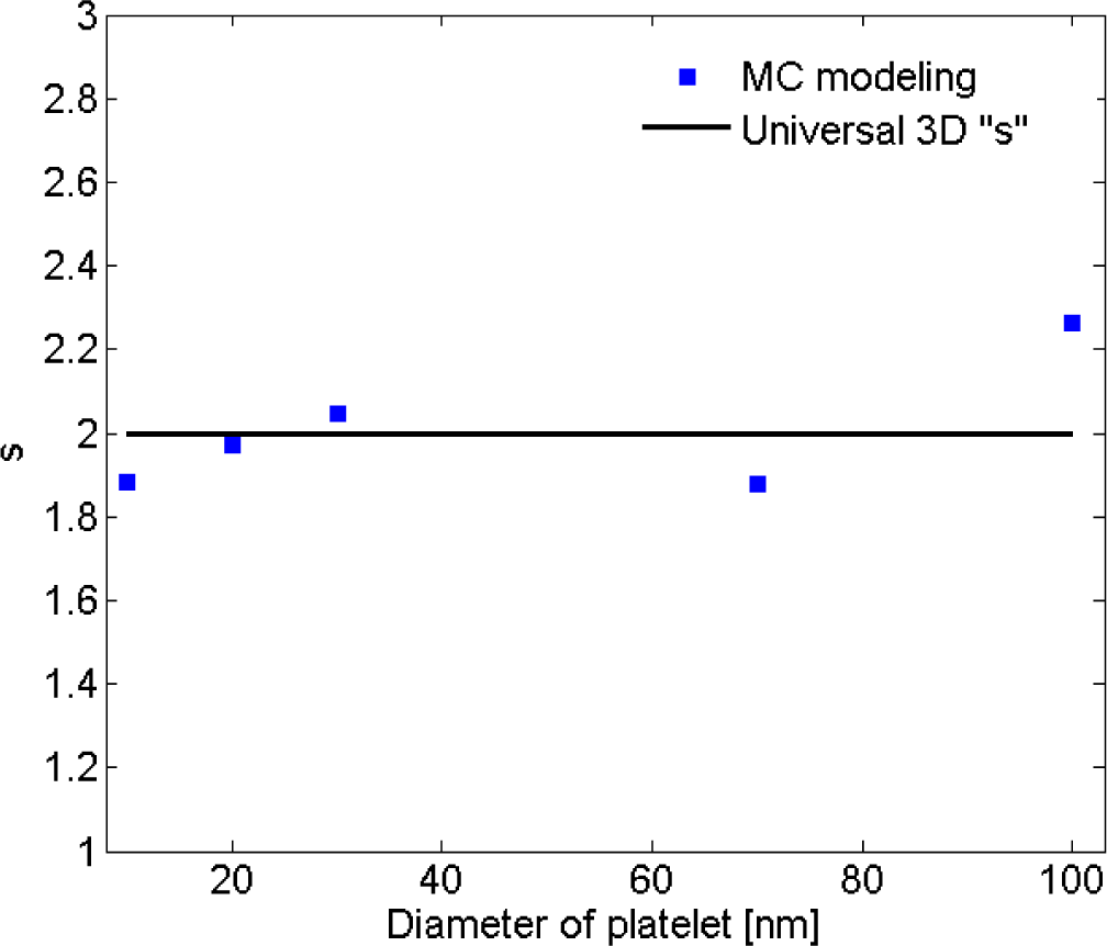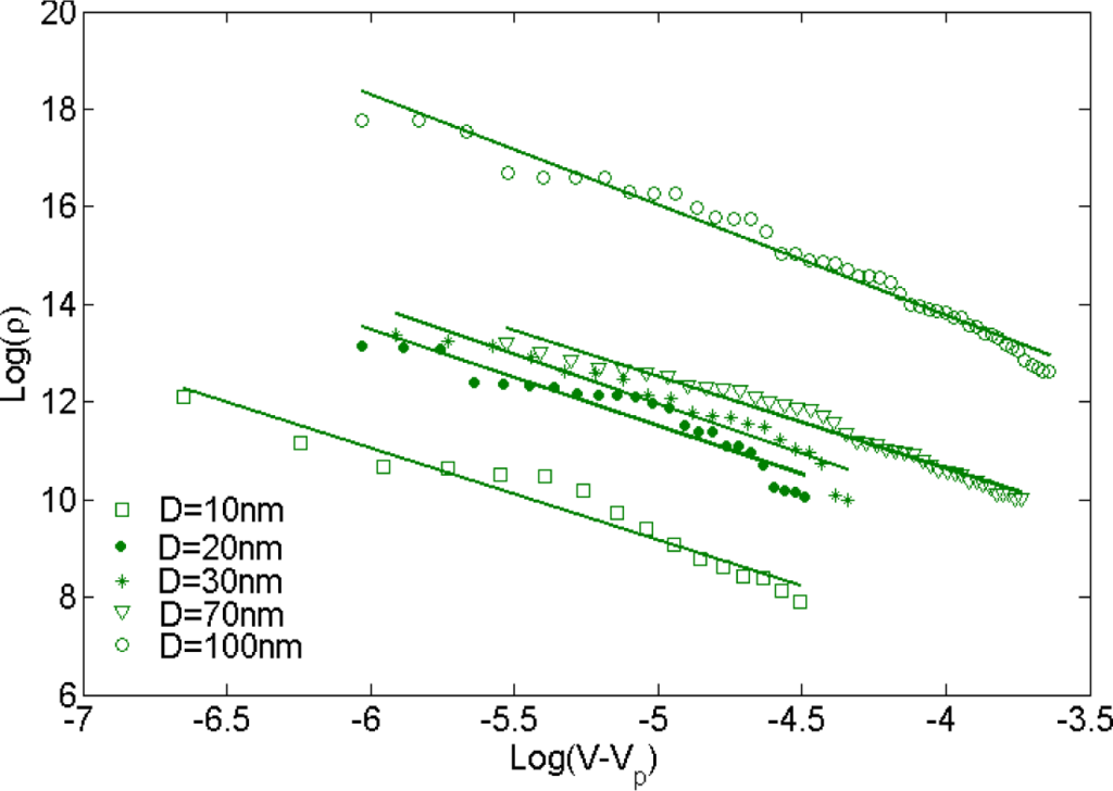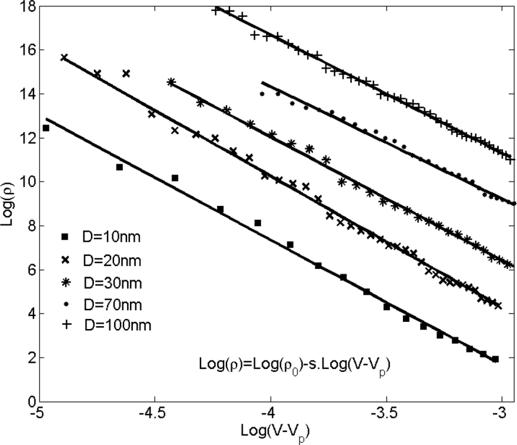 Balberg et al. [] showed that tunneling percolation conductivity yields a staircase effect in both lattice and continuum percolation systems. They also reported that the existence of the staircase percolation behavior is validated by experimental data [,–]. Based on these findings the resistivity/filler-loading curves cannot be described by a single percolation threshold and critical exponent. In other words, Equation (1) cannot adequately describe any given set of resistivity/volume-fraction data, and each subset of data should be described with different values of s and Vp. The present study confirmed that a single expression with specific values of s and Vp is insufficient to represent the entire nanocomposite conductivity and percolation behavior. This is illustrated in Figure 8, where the power-law description with a universal value of s (su = 2) was fitted to the resistivity data for nanocomposites with filler diameter of 20 nm. For low volume fractions the data points deviate little from the universal description, while the deviation increases with filler concentration. Interestingly, a threshold can be inferred from the curve at which the critical exponent regime changes. Findings illustrated in Figure 9 are results obtained from fitting Equation (1) to a data subset with interval of (Vp, 1.4Vp). Figure 10 shows the power-law approximation for higher filler volume fractions. As illustrated by Figure 11, fitting Equation (1) to the dilute region of the curve yields values of s with small deviation from su. Employing the power-law equation to describe the composite behavior for higher volume fractions, on the other hand, yields a mean value of 5.56 for the critical exponent, i.e., s deviates strongly from su. Comparing Figures 9 and 10 reveals that the conductivity/filler-loading curves describe a rather smooth behavior for volume fractions well above the percolation region, while a somewhat “erratic” behavior can be observed near the percolation threshold. Assuming a single expression for the description of nanocomposite conductivity may necessitate ignoring the percolation neighborhood and considering its data outliers. As mentioned in [,], close agreement between s and su is expected to be restricted to a small region near the percolation threshold, and non-universal percolation behavior becomes dominant as the filler volume fraction is increasing. Based on the above considerations, results obtained in the present study for conductive circular nano-disks indicate a critical exponent that is filler content dependent and converges toward the universal value with filler loading approaching the percolation threshold. This conclusion is congruent with findings from Johner et al. []. Data for different nano-disk sizes given in Figures 9, 10 and 12 further indicate an increasing percolation threshold and electrical conductivity with increasing nano-disks size. Note that the trendline shown in Figure 12 only illustrates the data trend.