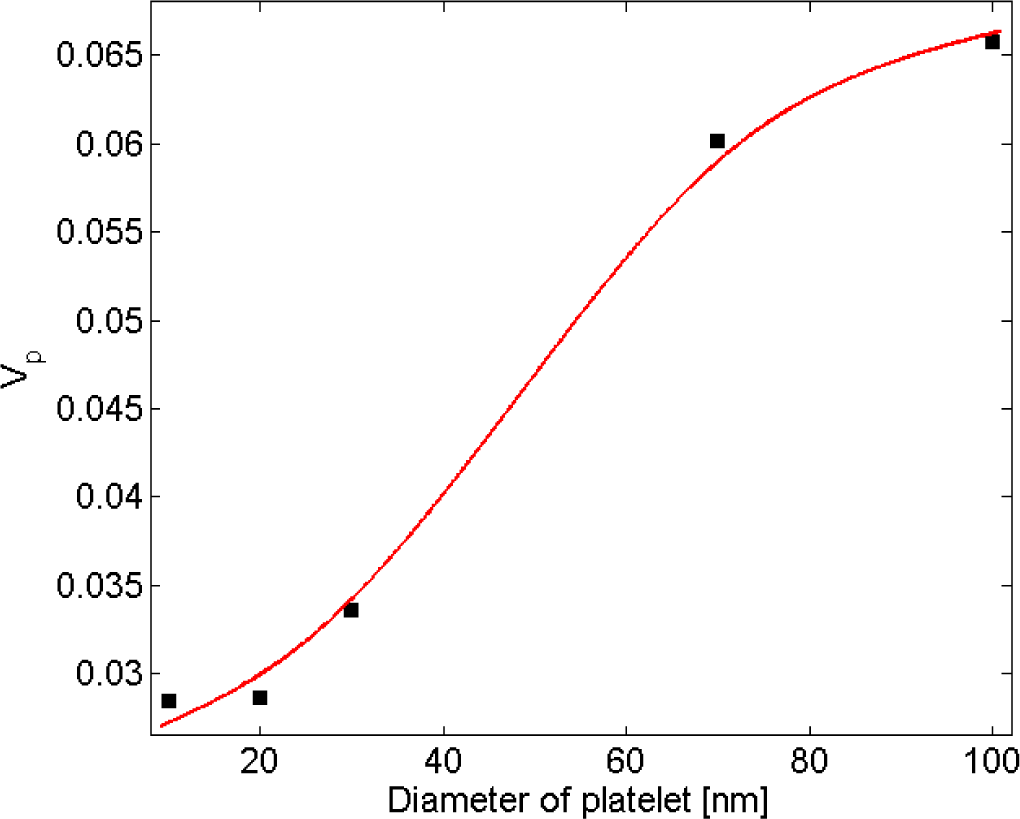 Ambrosetti et al. [] studied the percolation threshold for hard oblate ellipsoids of revolution surrounded by a penetrable soft shell, which is analogous to the electron tunneling concept employed in the present study. Nano-disks can be assumed as spheroids where the major axis a is much larger than the minor axis b (axis of symmetry). In [], it was shown that the percolation threshold is governed by the ratio of the major axis to the minor axis, a/b, and the ratio of the soft shell thickness d to the major axis, d/a. In the present study, parameters a, b and d are equivalent to the nano-disk radius, thickness and tunneling distance, respectively. As illustrated in Figure 13, percolation thresholds for different oblate radii (i.e., 1.25, 1.88, 2.92, 5.00, 7.10, 11.25 nm) were computed keeping b and d constant at 0.17 nm (disk thickness/2) and 1.25 nm (tunneling distance/2), respectively. Disk radii were chosen to correspond to percolation thresholds provided in []. Critical volume fractions provided in Figure 13 include the volume of the soft penetrable shell surrounding the hard oblates. As explained previously, the soft shell is equivalent to tunneling distance concept in this study, so the volume of the soft shell has been deducted from the volume fraction provided by Figure 13 using the correction factor a2b/((a + d)2(b + d)). Resulting percolation thresholds are given in Figure 14, which indicates an increasing percolation threshold for an increasing oblate major axis (tunneling distance and oblates thickness are constant). It worth noting that in the present study the percolation threshold was evaluated for circular nano-disks, while in [] the percolation threshold of oblates was investigated, and results from [] are provided herein to illustrate the qualitative agreement between trends.