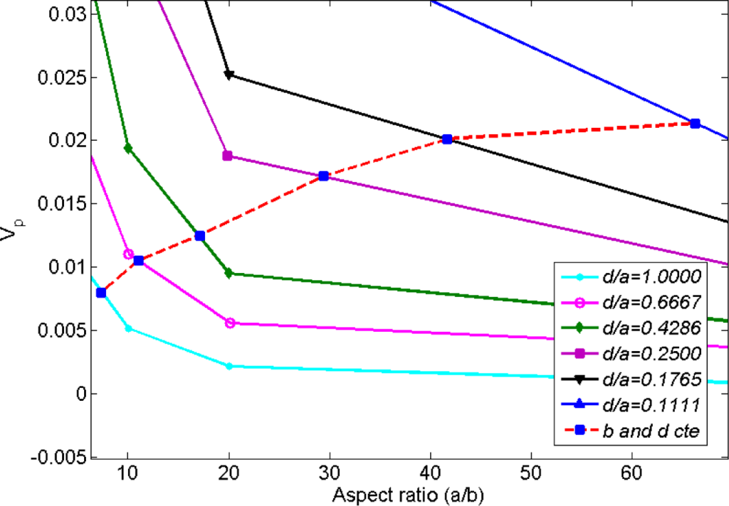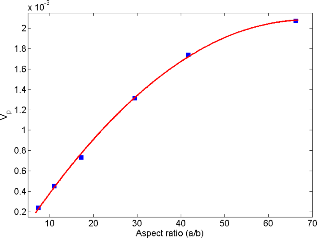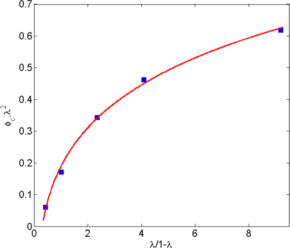 In another work, Lee and Torquato [] evaluated the critical area fraction for 2D circular disks with impenetrable radius of λR surrounded by a penetrable shell with thickness (1 − λ)R, dispersed in a 2D domain. Similar to Ambrosetti’s work [], (1 − λ)R is equivalent to the tunneling distance used in the present study. In [] the critical area fraction is given in term of λ. In Figure 15 percolation thresholds are replotted versus λ/(1 − λ), a parameter representing the ratio of disk diameter to tunneling distance. Values for the percolation threshold were multiplied by λ2 to exclude the area of the penetrable shell that is equivalent to the tunneling distance. As illustrated by Figure 15, the percolation threshold increases as the ratio of disk size to the tunneling distance is increasing. Furthermore, Mathew et al. [] showed that the dependency of platelet based conductive composite percolation threshold on the aspect ratio is in contradiction with that of needle-like fillers [–]. In other words, trends obtained for the relation between aspect ratio and percolation threshold of needle-like fillers cannot be generalized to a platelet-like filler percolation problem.