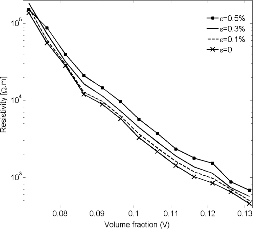 Employing the methods described in Section 2.3, the piezoresistivity behavior of nanocomposites with nano-platelet inclusions was investigated. Simulation results shown in Figure 16 for unstrained nano-composites and three applied tensile strains (ε = 0.1%, 0.3%, 0.5%) demonstrate an increase in resistivity with applied strain.