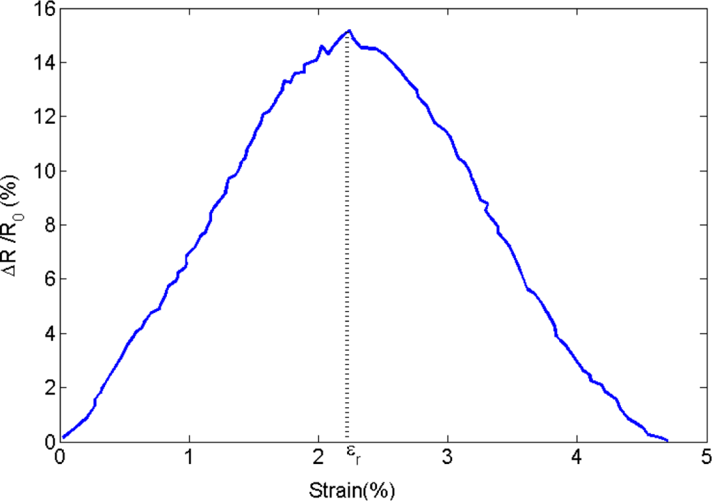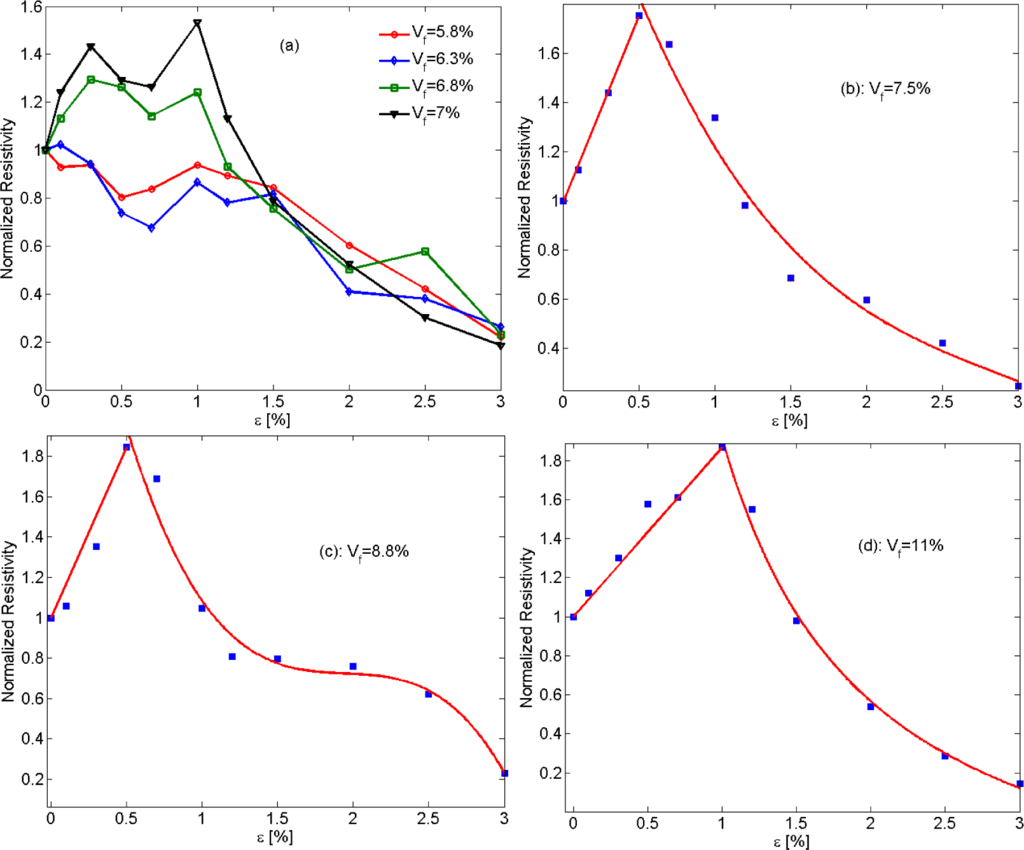 It is interesting to note that for some intermediate filler volume fractions, i.e., volume fractions between those shown in Figure 17b, d, a diminished piezoresistivity effect can be observed for increasing strain as indicated by the plateau in the curve shown in Figure 17c. This behavior can be explained considering aforementioned piezoresistivity mechanisms in conductive nano-composites, that is, at strain levels within the plateau region none of the two-piezoresistivity mechanisms is dominant; thus their effects cancel each other, leading to diminutive piezoresistivity behavior.