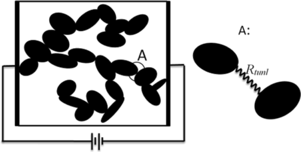 Electrical connection between two conductive inclusions arises from two different mechanisms, i.e., (i) mechanical contact between conductive particles; or (ii) electron tunneling effects. Based on quantum mechanical tunneling theory, electrical current can flow under certain conditions through an insulator material. In other words, it can be assumed that a pair of conductive inclusions dispersed in an insulator matrix is electrically connected by a resistor formed by the matrix so that electrons can passage from one inclusion to the adjacent one. It was shown in different studies that tunneling conductivity plays the dominant role in the conductivity of insulating polymers filled with conductive inclusions []. For strongly conductive fillers the intrinsic filler conductivity has no appreciable contribution toward the nonlinear current-voltage behavior of nanocomposites, with nonlinearity arising from tunneling effects. Experimental research works devoted to studying the current-voltage behavior of carbon nanotubes (CNT) based [,] and graphene nano-platelet based [,] conductive nanocomposites indicate that nonlinear current-voltage behavior is more pronounced for disk-shaped fillers. The significant dependency of conductivity on voltage in circular disks indicates that conductivity is indeed governed by tunneling mechanisms. As shown by Simmons [], electron tunneling resistivity can be described by Equation (3) for a low-voltage range when eΔV << λ, where ΔV is the electrical potential, e is the quantum of electricity and λ is the barrier height of the insulator.