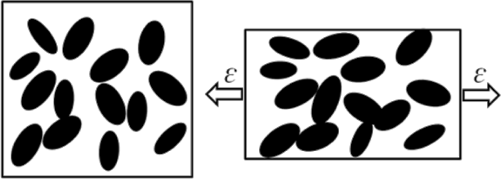Subjecting a polymer with conductive inclusions to mechanical strain, as shown in Figure 4, is often accompanied by a change in resistivity. This behavior is known as the piezoresistivity effect, which is an interesting characteristic of conductive nano-composites rendering them good candidates for sensor applications. Generally, there are two main reasons for piezoresistive behavior of nano-composites, i.e., (i) changes in interparticular distance; and (ii) reorientation of conductive particles. Piezoresistivity of nanocomposites with conductive inclusions has been the subject of several numerical and analytical works [,–]. In the present study, the described framework of Monte Carlo simulation and finite element modeling were employed to evaluate the piezoresistive behavior of conductive composites with nano-platelets. Most conductive nano-fillers have superior mechanical properties in comparison to the matrix. As a consequence their deformation was neglected for a nanocomposite being subjected to mechanical strain, and conductive nano-platelets were assumed to undergo rigid body motion only. Note that nano-platelets such as graphene may be wrinkled or crumpled when dispersed in a host polymer. The probability of being non-planar increases as the size of the nano-disk is increasing. Since this study was conducted for small-size nano-disks, it was assumed that disks remain planar during dispersion and mechanical loading. Further work may be conducted to evaluate the effect of wrinkling and bending on the nanocomposite electrical behavior. The new position and orientation of the nano-platelets in the deformed matrix (for uniaxial tensile strain) were determined using affine transformation utilizing the formulation developed by Pham []. Filler reorientation and displacement inside the polymer matrix is also governed by lateral mechanical strain, which is induced by Poisson’s ratio effects. For numerical simulations the Poisson’s ratio was set at 0.33, which was found to be the mean value reported in the literature for the Poisson’s ratio of nano-platelet based conductive composites. A 3D resistor network was then re-developed for the updated nano-platelet structure, and aforementioned finite element modeling was employed to evaluate the conductivity of the strained nano-composite.