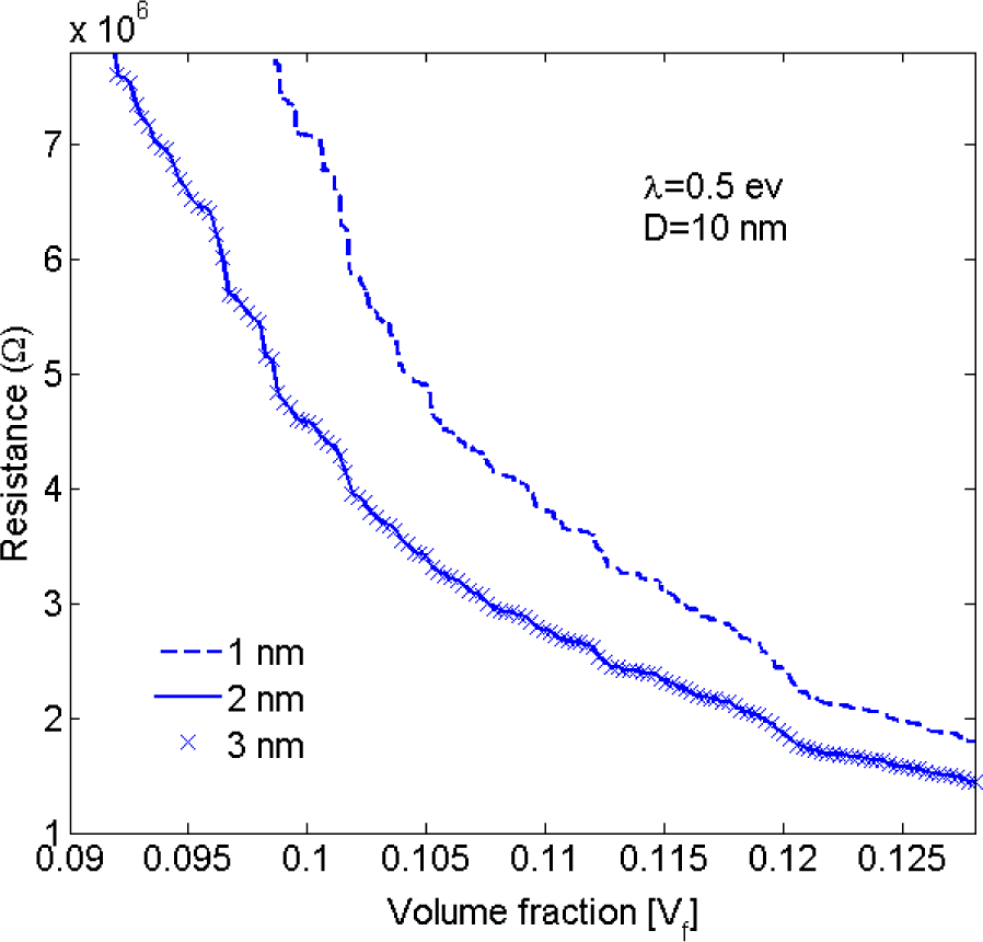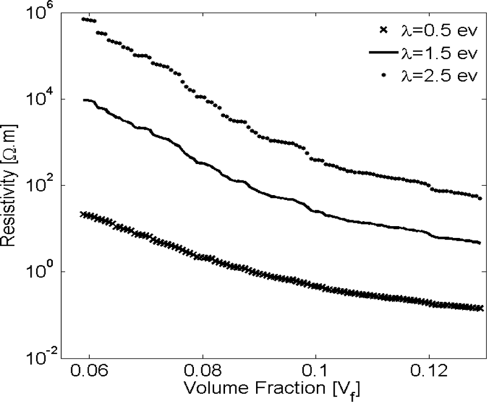 It was stated previously that the polymer matrix chiefly affects the electrical resistivity of a nano-composite, especially for lower filler volume fractions. As such, the contribution of matrix electrical properties, i.e., the barrier height λ should be investigated. Electrical resistivity was evaluated for three different barrier heights, i.e., 0.5, 1.5 and 2.5 eV, representing typical values reported as height of barrier for epoxy [] filled with randomly dispersed nano-platelets. Results illustrated by Figure 6 indicate that the matrix barrier height strongly affects the nano-composite conductivity. For example, for a filler volume fraction of 7.5% the electrical resistivity of a nano-composite with λ = 1.5 eV is more than two orders of magnitude greater than for a matrix with λ = 0.5 eV.