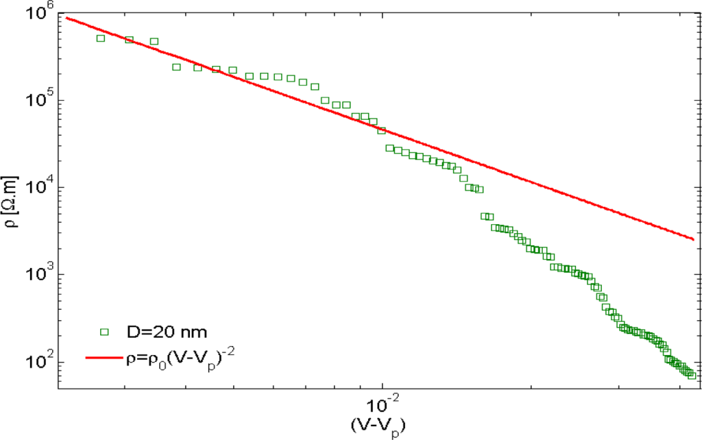 Figure 7 illustrates the resistivity of nanocomposites with respect to changes in nano-disks volume fraction. A critical volume fraction is recognizable at which a sharp drop in nanocomposite resistivity occurs. This region was considered the formation of a percolation network.