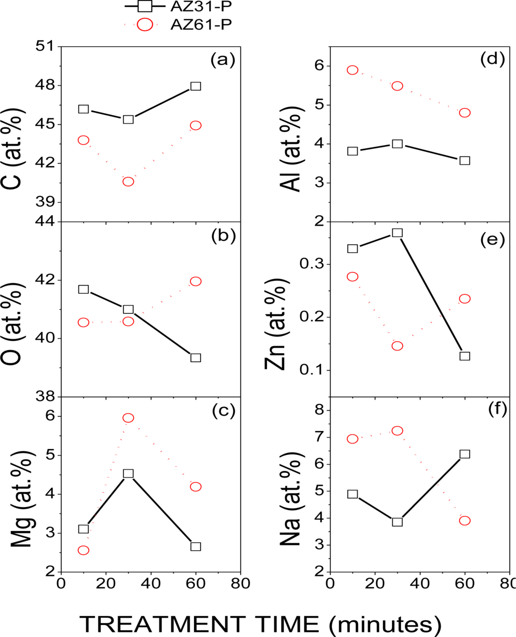 Figure 1 compares the evolution of the atomic percentages of C, O, Mg, Al, Zn and Na obtained by XPS on the surface conversion coatings formed on the AZ31-P and AZ61-P substrates with the treatment time in saturated NaHCO3 solution. No significant differences in these percentages were observed in the AZ31-P and AZ61-P specimens after different treatment times.