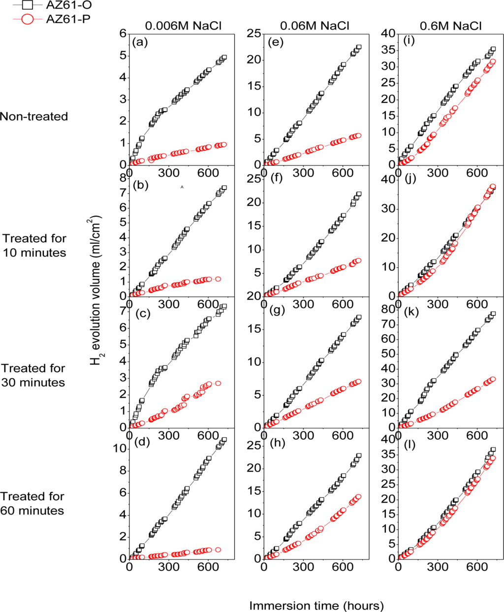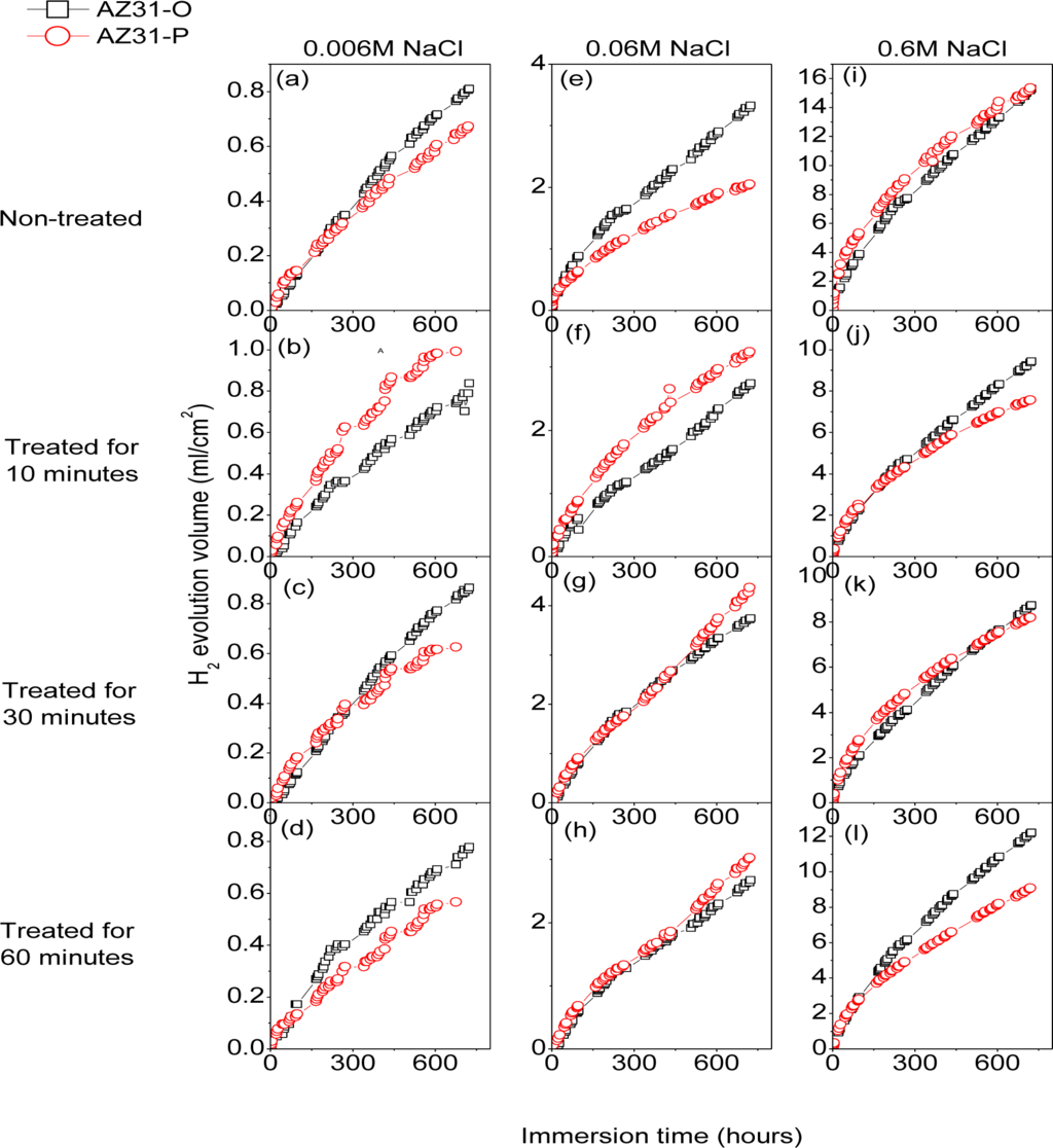 Figure 10 compares the hydrogen evolution versus time curves for the AZ61-P substrate non-treated and after 10, 30 and 60 min of NaHCO3 treatment and those corresponding to the AZ61-O substrate during immersion in 0.006 M NaCl (a–d), 0.06 M NaCl (e–h) and 0.6 M NaCl (i–l) for 700 h. In contrast with the AZ31 alloy, significantly lower hydrogen evolution data were observed in the AZ61-P specimens during immersion in 0.006 M (Figure 10a–d) and 0.06 M NaCl (Figure 10e–h) than those corresponding to the AZ61-O substrate. Also, lower values of hydrogen volume were measured in the AZ61-P substrate treated for 30 min compared to those of the AZ61-O substrate during immersion in 0.6 M NaCl (Figure 10k).