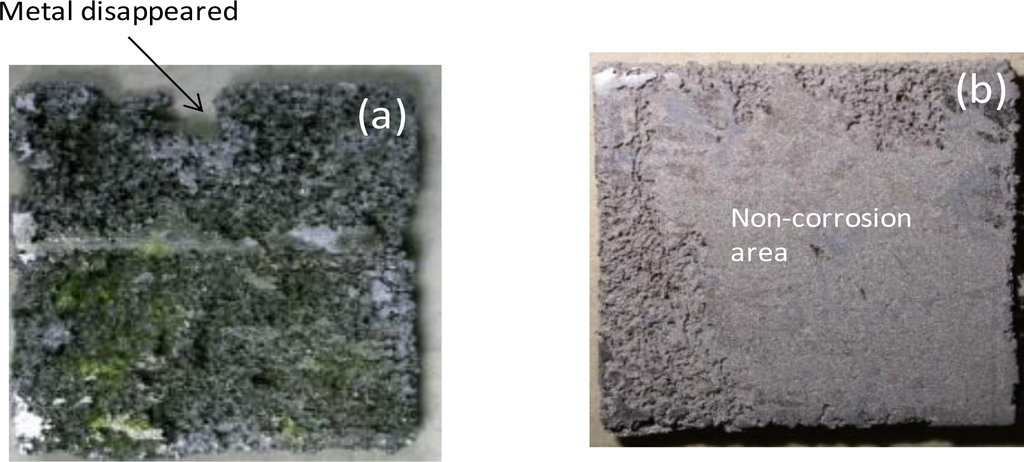 The morphology of the attack on the corroded surface was examined at low magnification and a camera was used to take the photographic images. Once the test was finished, the corroded specimens were stripped in a solution of 200 g/L CrO3 and 10 g/L AgNO3 at room temperature to eliminate the corrosive products remaining on the surface, then rinsed with isopropyl alcohol and dried in hot air in order to study the corrosion morphology.