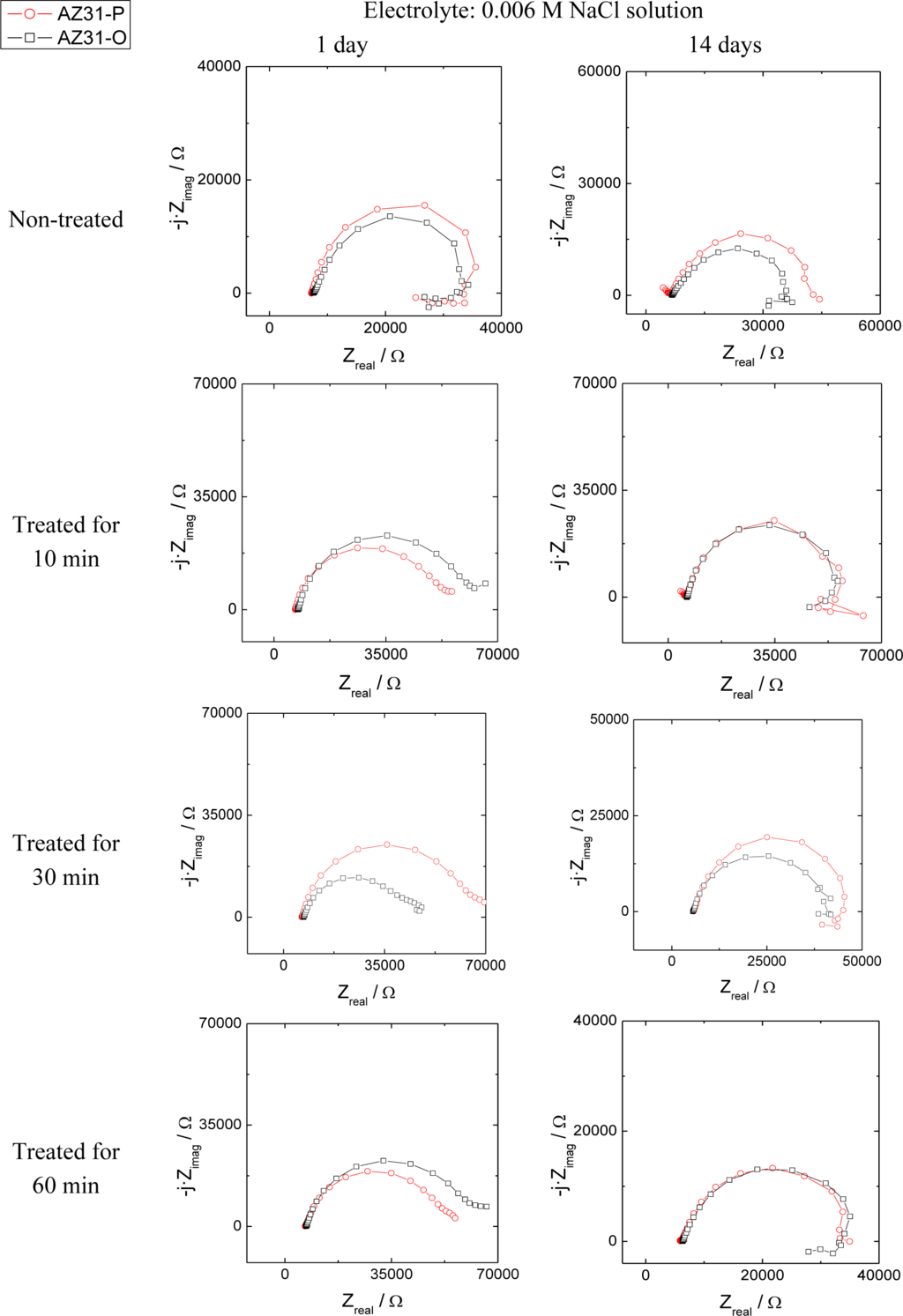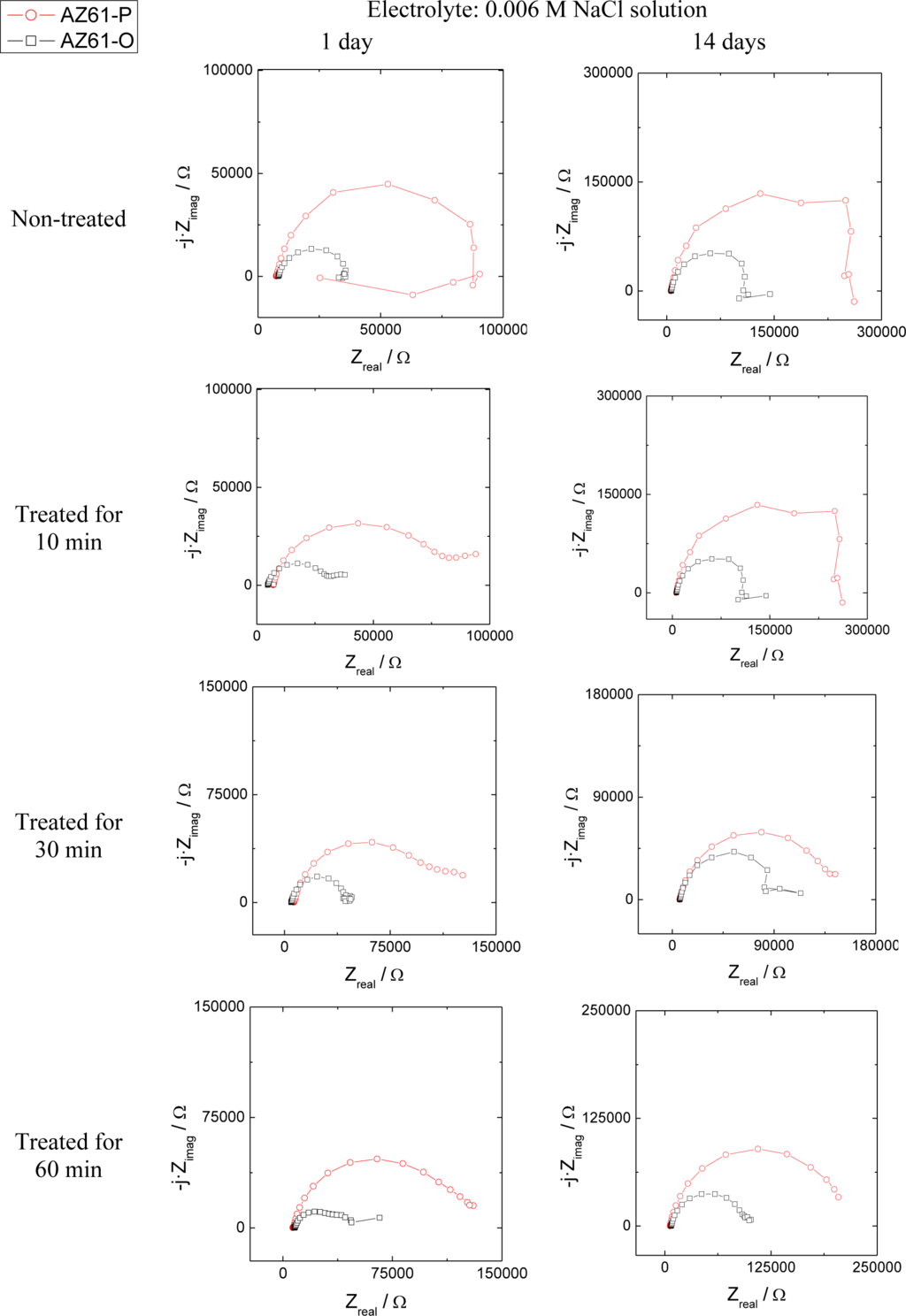 The evolution of the corrosion process on the treated AZ31 and AZ61 alloys as a function of the treatment time and substrate surface conditions has been monitored by means of impedance measurements during immersion in 0.006 M NaCl solution. Nyquist diagrams (Figures 12 and 13) show apparently one single capacitative loop at high frequencies (HF) during the different stages of testing. In some specimens, an inductive loop at low frequencies (LF) tends to become more or less patent (Figures 12 and 13).