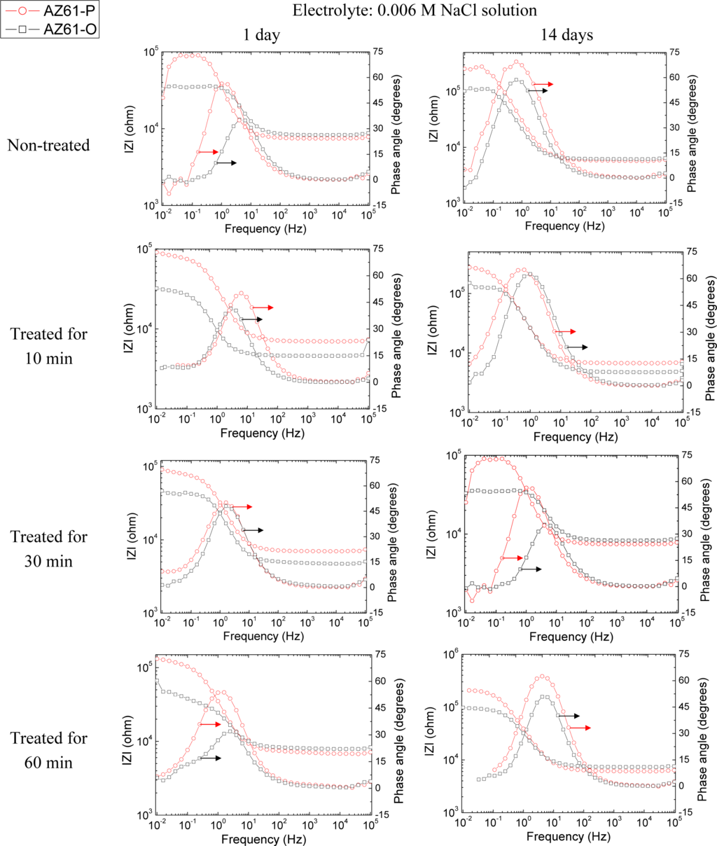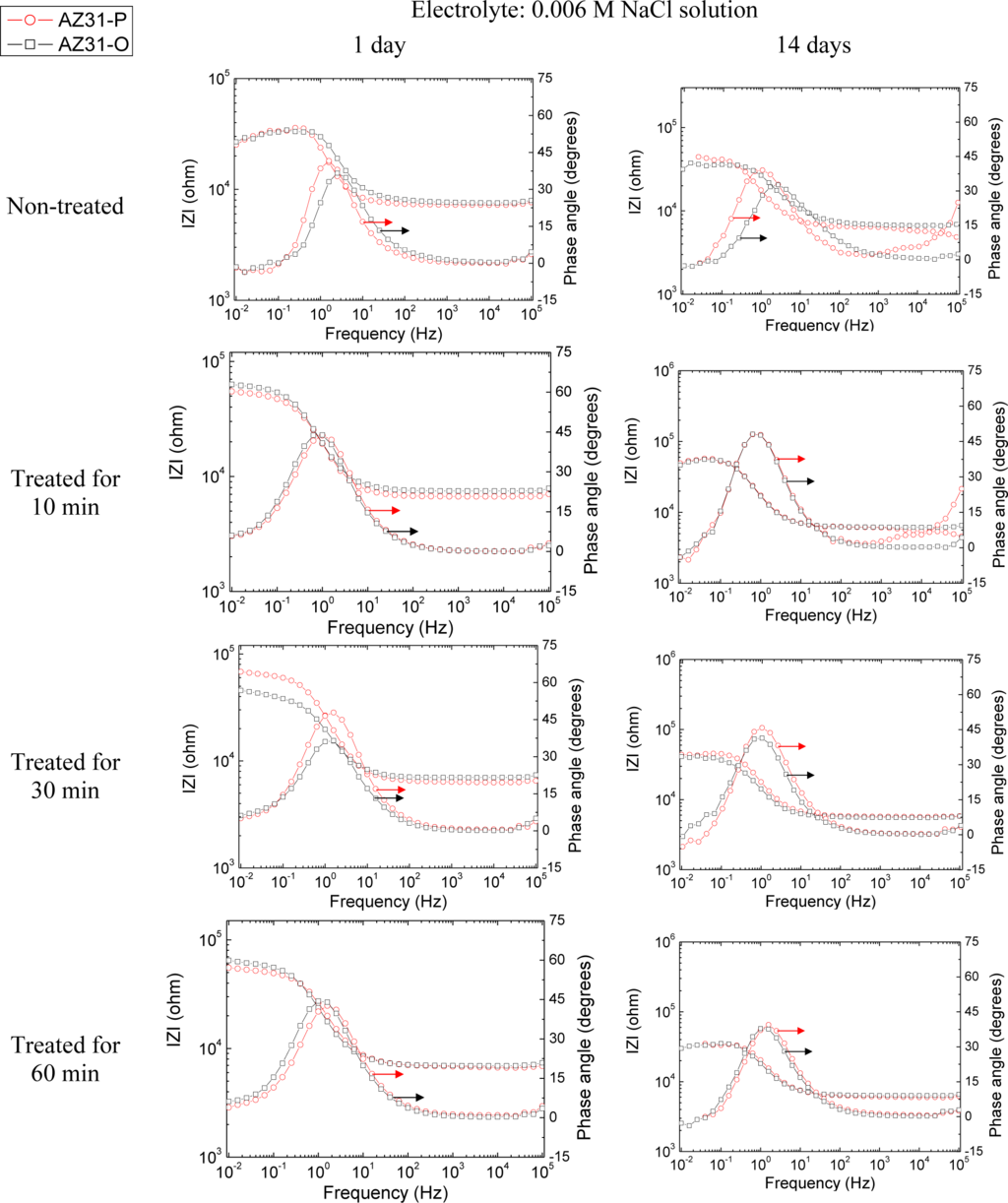 Representative impedance spectra of the tested specimens in terms of Bode plots are shown in Figures 14 and 15. They seem to show apparently one time constant.