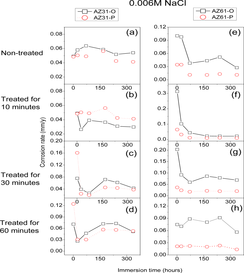 Corrosion rates in Figure 16 were obtained from RCT values by means of Equation 1, in which the constant of proportionality B (about 65 mV for the AZ31 alloy and 120 mV for the AZ61 alloy) was empirically determined by the correlation between electrochemical and gravimetric measurements. Corrosion rates in mA/cm2 were converted to corrosion rates (mm/y) by applying Faraday law. No significant differences in these values were observed in the AZ31-P substrate after different treatment times compared with those corresponding to the AZ31-O substrate (Figure 16a–d). In contrast with the AZ31 alloy, significantly lower corrosion rate values than the AZ61-O substrate after different treatment times were observed in those corresponding to the AZ61-P substrate (Figure 16e–h). It is interesting to note that similar trends regarding the corrosion behavior are deduced from these electrochemical values as from the hydrogen evolution ones (Figure 9a–d and Figure 10a–d).
