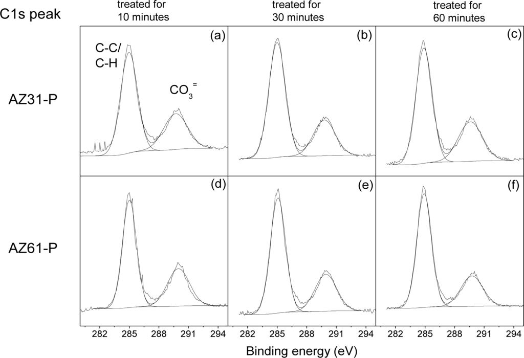 Figure 2 compares the C1s high-resolution spectra obtained on the surface of the conversion coatings formed on the AZ31-P substrate treated for 10 min (a), for 30 min (b), for 60 min (c), with those obtained on the AZ61-P substrate treated for similar times (Figure 2d–f). The spectra may be fitted using two components at different binding energies. The first component is situated at approximately 285.0 eV, and is normally interpreted as carbon in the form of C–C/C–H groups; and a less intense component about 4.5–5.0 eV higher, which is associated with the presence of magnesium carbonate [20].