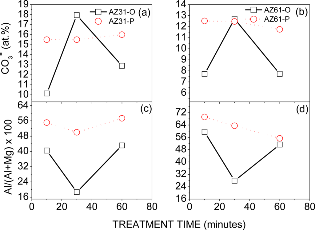The carbonate contents determined by XPS on the surface of the AZ31-P and AZ61-P substrates after 10 min of treatment reach values of 50% and 60% higher than on AZ31-O and AZ61-O samples, respectively (Figure 3a,b). Taking into account the solubility products of the magnesium carbonate (6.82 × 10−6 [25]) and magnesium hydroxide in water (5.61 × 10−12 [25]) the solubility of hydroxide probes to be enormously higher than that of carbonate, so that this latter compound will preferably precipitate [26]. In the early stages of treatment, it is probable that the oxide film that forms spontaneously on the polished substrate surface, much more perfect and protective than the film on the as-received surface [17,18,27], contributes to a significant decrease in the magnesium dissolution process and the production of OH− ions from the cathodic reaction decreasing the pH in the vicinity of the metal surface and allowing and favoring the stability and preferential formation of magnesium carbonate products rather than that of magnesium hydroxide.
