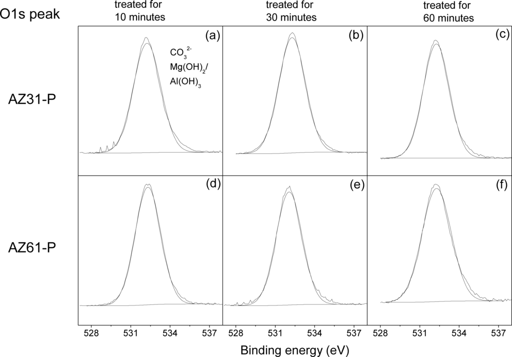 Figure 4 compares the high resolution O1s spectra obtained on the surface of the conversion coatings formed on the AZ31-P substrate treated for 10 min (a), 30 min (b) and 60 min (c), with those obtained on the AZ61-P substrate treated for similar times (Figure 4d–f). The spectra obtained are fairly similar, containing one single component at a binding energy of 532.2 eV associated with the presence of magnesium carbonate or magnesium hydroxide form [28] and/or Al(OH)3 [29].