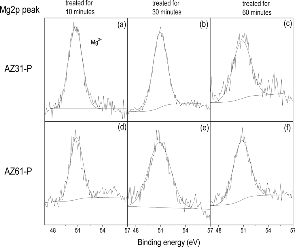 Figure 5 compares the high resolution spectra Mg2p peak obtained on the surface of the conversion coatings formed on the AZ31-P substrate treated for 10 min (a), for 30 min (b), for 60 min (c), with those obtained on the AZ61-P substrate treated for similar times (Figure 5d–f). The spectra obtained contain one single component at a binding energy of 50.8 eV associated with the presence of magnesium in the form of magnesium hydroxide/carbonate [30].